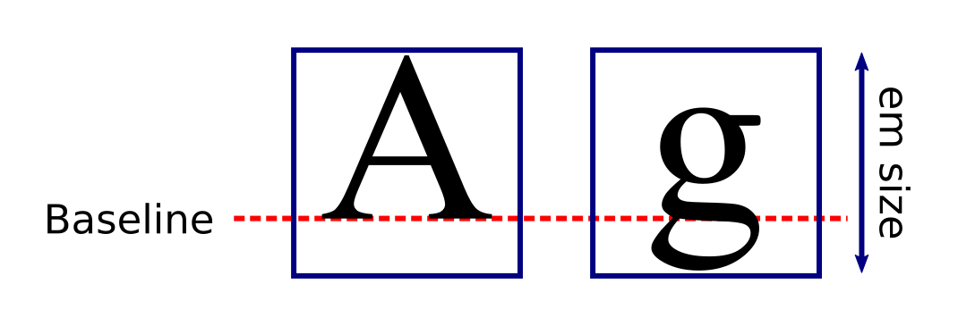 We can solve this by generalising the idea of the height, and instead defining a square that fits around most of the characters. It is called the em square, and the size of that square is the em size: