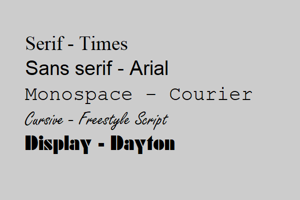 Although there are many different fonts, but they mainly fit into five different families - serif, sans serif, monospace, cursive, and display. These are general categories, so some fonts might not fit easily into any of these families, but most do. This code displays an example of each type of font:
