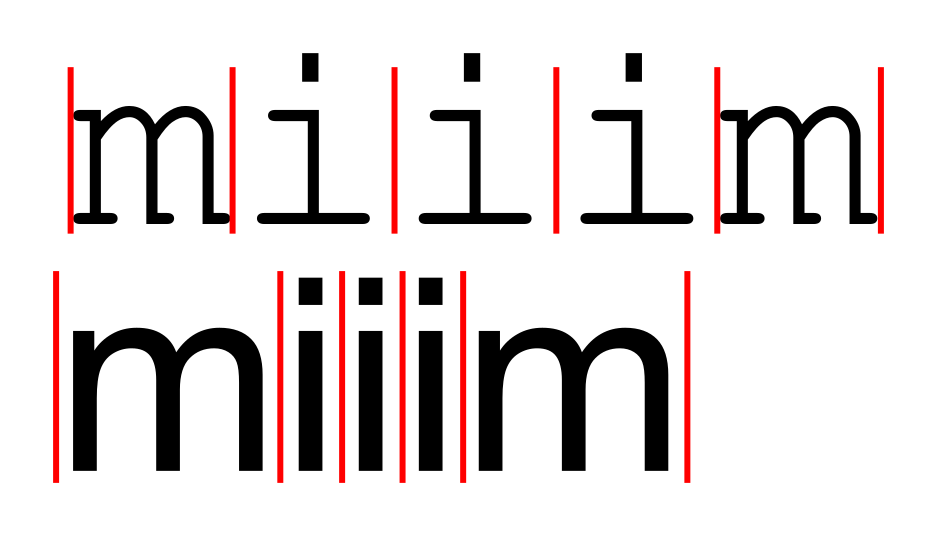 The fonts above, like most fonts, are proportionally spaced fonts. This means that different characters have different widths. For example, a letter ‘m’ in wider than a letter ‘i’. With Monospace fonts, all characters have exactly the same width. This is shown below, the top line is a monospaced font, the bottom line is a proportionally spaced font.