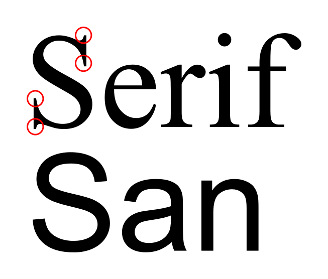 Serif fonts have marks (called serifs) that decorate the letter shapes. Sans serif fonts have a plainer design. This diagram shows the difference (the serifs on the ‘S’ are circles in red):