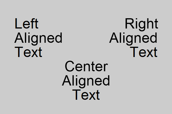 Notice that all the left_align calls use an x value of 50. That means that the left hand side of all three strings will be aligned at x position 50. All the center_align calls use an x value of 300. That means that the centre of all three strings will be aligned at x position 300. Similarly the right_align calls all align the right hand side of the text at 550.