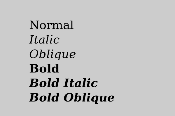 In addition to the normal font style, text is often displayed in italic or bold styles. These styles are applied via optional parameters when you create the font.