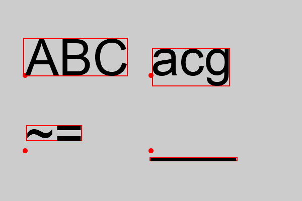 In the image below, we show several text strings. For each string we show its text extents as a red outline, and the text position (x, y) as a red dot: