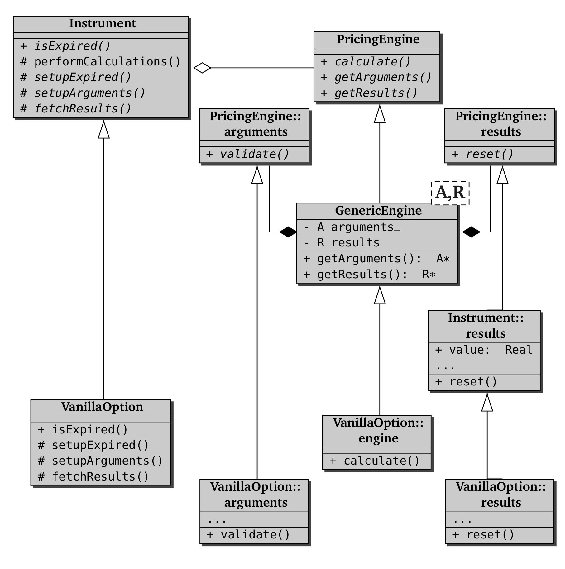これらのアクセサリークラスについて、2点コメントします。一点目は、この例を紹介した際に私が述べたことに反し、(クラス内クラスとして、このクラス特有の計算結果を保持するために定義されたはずの)VanillaOption::resultsクラスの中で、メンバー変数を全く宣言していません。これは、実装内容の詳細な仕組みを際立たせる為に、わざとそうしました。プログラム開発者は、いくつかの商品に共通するような計算結果を保持する構造体を定義したいと考えるかもせれません。そのような構造体は、派生クラスを作ることにより再利用が可能になるからです。Greeks構造体の例がまさにそれです。(訳注:様々なオプションで共通のリスク感応度の値を、Greeksという名前の構造体で定義しておけば、オプション毎にresults構造体のメンバー変数を定義せず、Greeks構造体を再利用すれば簡単で済む。)従って、このクラス(VanillaOption::results)は、Greeks構造体とInstrument::resultsクラスから派生させて、最終的な構造が構築されています。その際に、かの悪名高い菱形継承を避ける為、(Greeks::resultsもInstruments::resultsも)PricingEngine::resultsクラスからの仮想継承にしなければなりません。(継承のダイアモンドについては、例えば巻末(Stroustrup, 2013)参照)(訳注:VanillaOption::resultsは、Instrument::resultsとGreeks::resultsの2つのベースクラスから派生しているが、この2つのベースクラスは、いずれもPricingEngine::resultsから派生している。この場合、仮想継承にしておかないと、派生クラスからベースクラスのメソッドを呼び出す時、2つのルートが発生して曖昧さが発生する。)