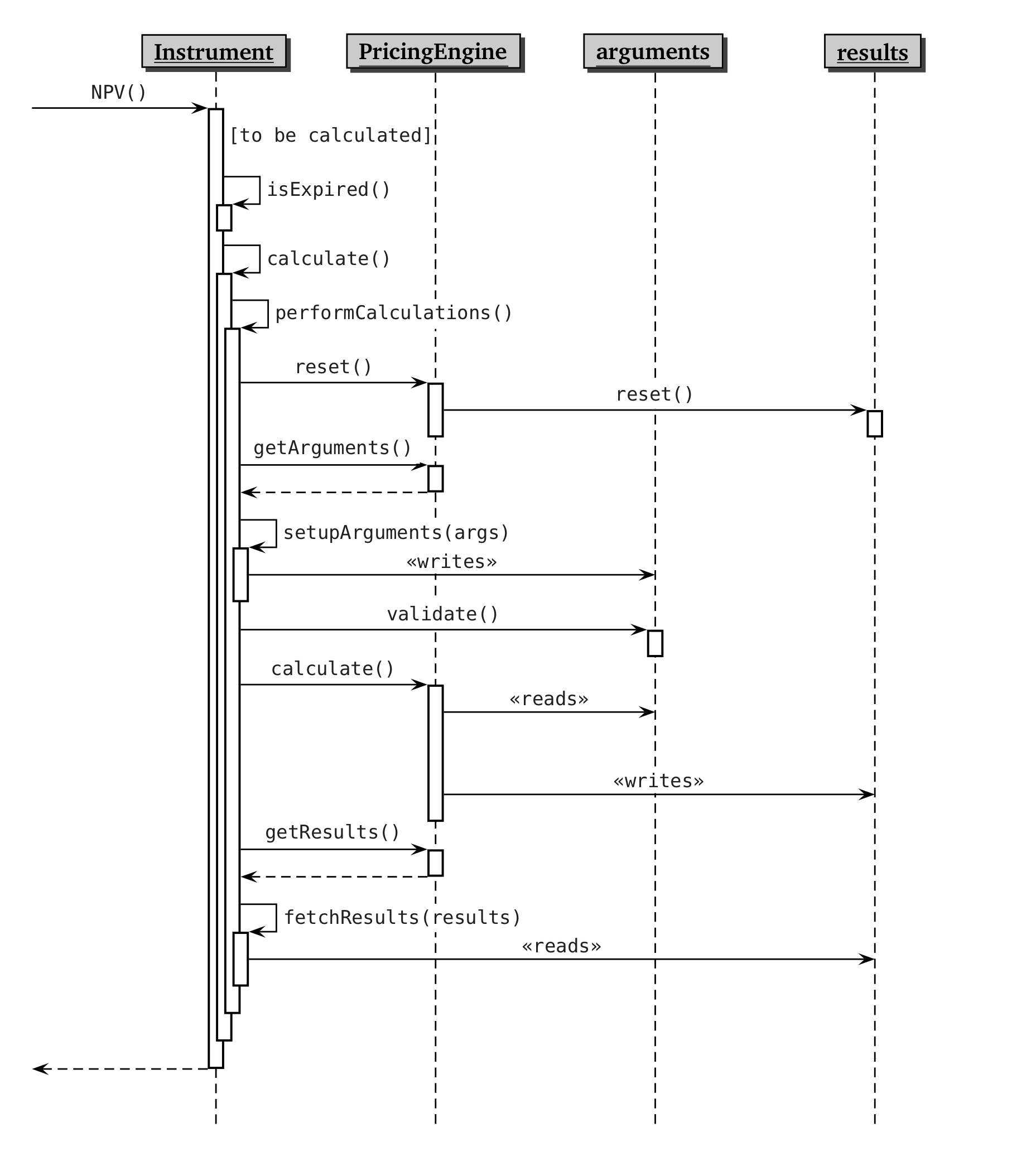 ここで追加されたコードも、Template Methodパターンに従って、派生クラスに、そのInstrumentに固有な計算アルゴリズムの実装を委任できるようにしています。(訳注:このクラスの段階でperformCalculations()を実装しておらず、さらに派生するクラスでの実装を前提にしている。)このクラスは、価格計算結果を一時保存するメンバー変数、NPV_を持っています。派生クラスではそこで必要なメンバー変数を追加で宣言する事ができます。(注:Instrumentクラスでは、ここでは書いていませんが、その他にerrorEstimate_変数が定義されており、NPV_に関する論点がそのまま適用できます)。