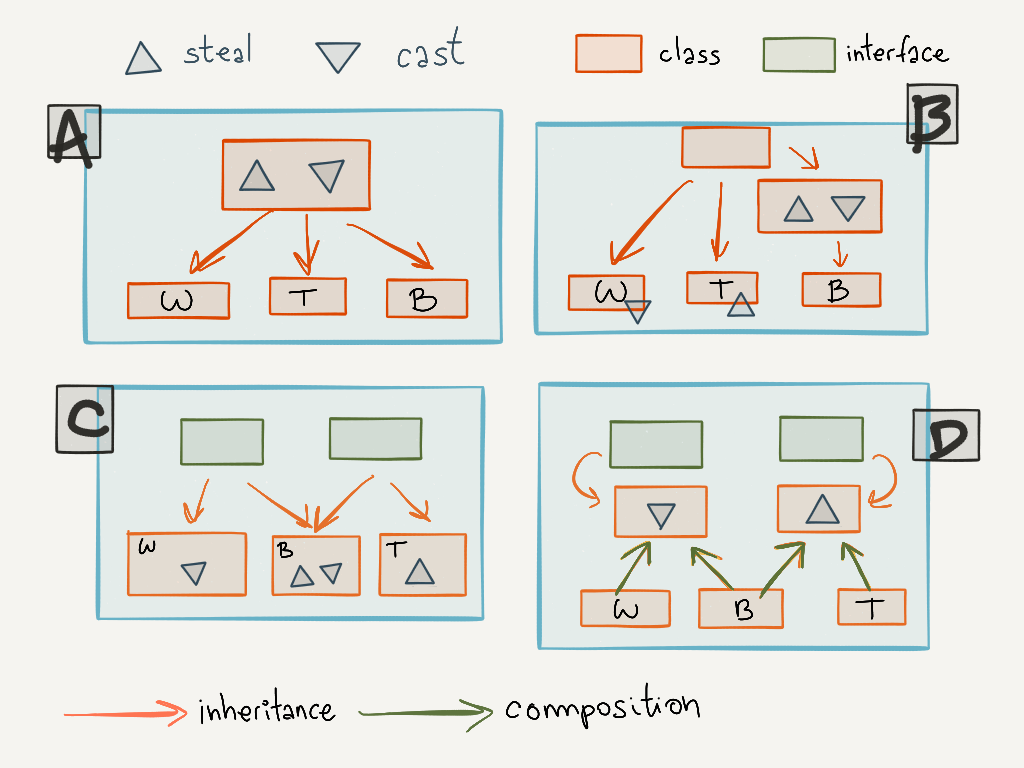 Now that we have encapsulated each behavior in a separate object we can compose them together to provide the necessary functionality to a wizard, a thief and a bard: