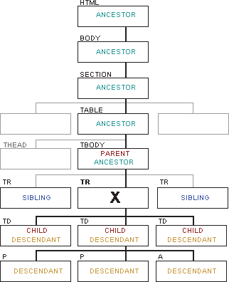 De drie td-tags binnen een tr-tag zijn siblings van elkaar. - Ancestor (voorouder)