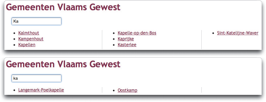 Merk op dat op lijn 5 de variabele dynamisch in de selector wordt verwerkt. Voor het zoekwoord ka wordt dit: $('li:contains(ka)').show();