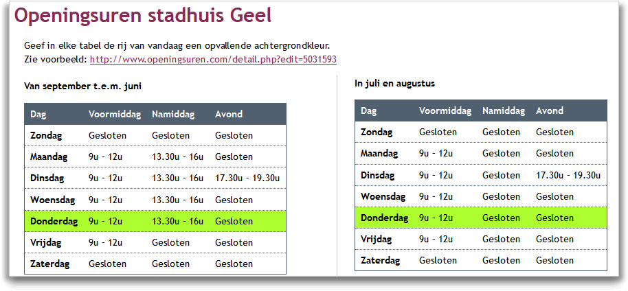 De pagina bevat twee tabellen waarop we de openingsuren van vandaag markeren. Elke weekdag komt overeen met één rij binnen de tbody-tag. Merk op dat we de tabel ook starten met zondag. Dit is een bewuste keuze omdat we het rijnummer dan makkelijk kunnen koppelen aan de weekdag van het Date-object.