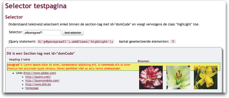Geef in het tekstveld een selectie in (bv: p#paragraaf1). Het script op de pagina gaat op zoek naar de selectie en voegt aan de selectie de class .highLight toe. Deze class tekent een groen kader rond de selector, maakt de achtergrond geel en kleurt de tekst rood.