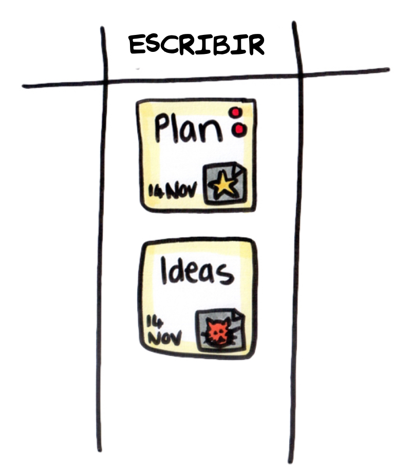Cada capítulo irá a Escribir donde uno de ellos escribirá el capítulo. Después de la escritura va a Imágenes donde pasarán el capítulo a Roxana para que dibuje las imágenes necesarias para ese capítulo. Después de Imágenes va a Editar donde el capítulo irá a Maryann para la edición y entonces el capítulo estará hecho. ¡Una vez que todos los capítulos estén hechos el libro estará terminado! ¡Voila!
