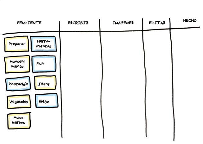 Para la primera versión del libro, se centrarán en lo que se necesita para crear una huerta, ya que se han dado cuenta de que cada vez más de sus clientes quieren hacer esto. Ya han decidido qué capítulos tendrá el libro y habrá nueve. También tienen una amiga, Roxana, que va a hacer todos los dibujos que necesitan y, una cliente, Mary Ann, que se ha ofrecido a editar el libro para ellos. Juan hizo una investigación y ha convencido a Lisa y Emma para utilizar Kanban para ayudarles a escribir el libro.
