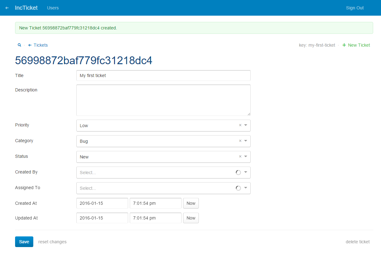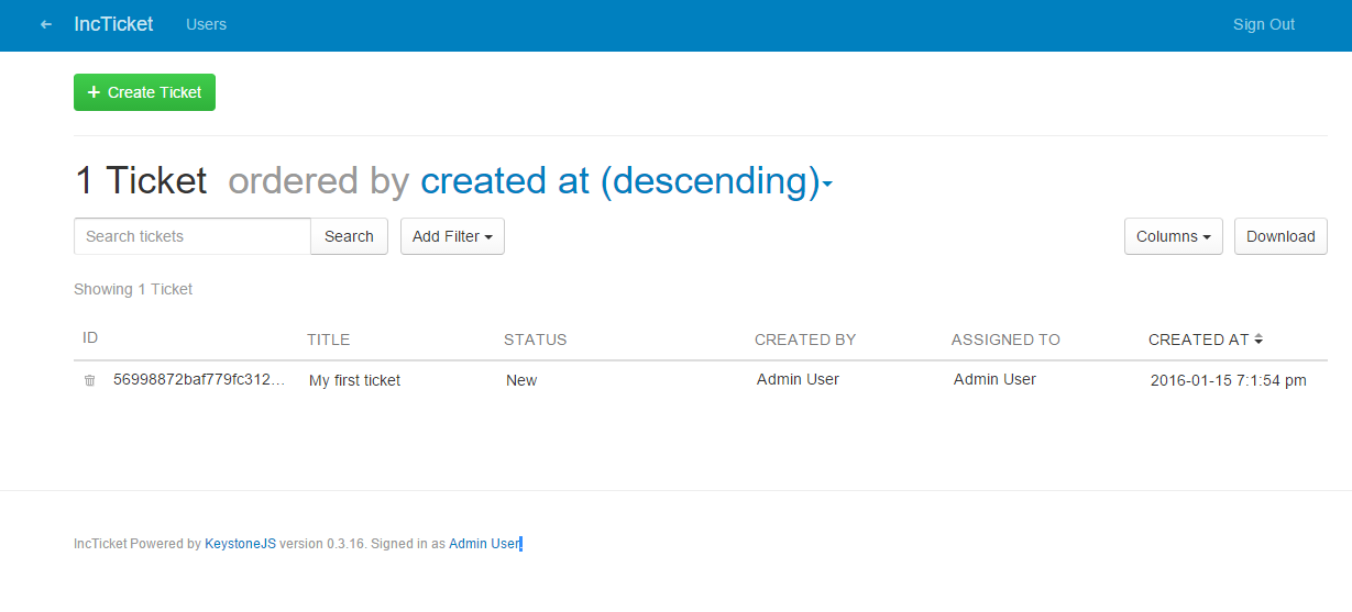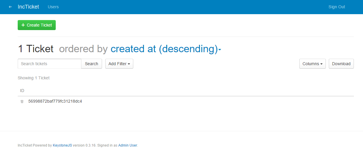 Open the command prompt and execute the command node keystone.js to restart the application server. Open http://127.0.0.1:3000/tickets/ in your browser and you will see everything running. Note that you need to have some tickets in order to see them here. You should see something like this: