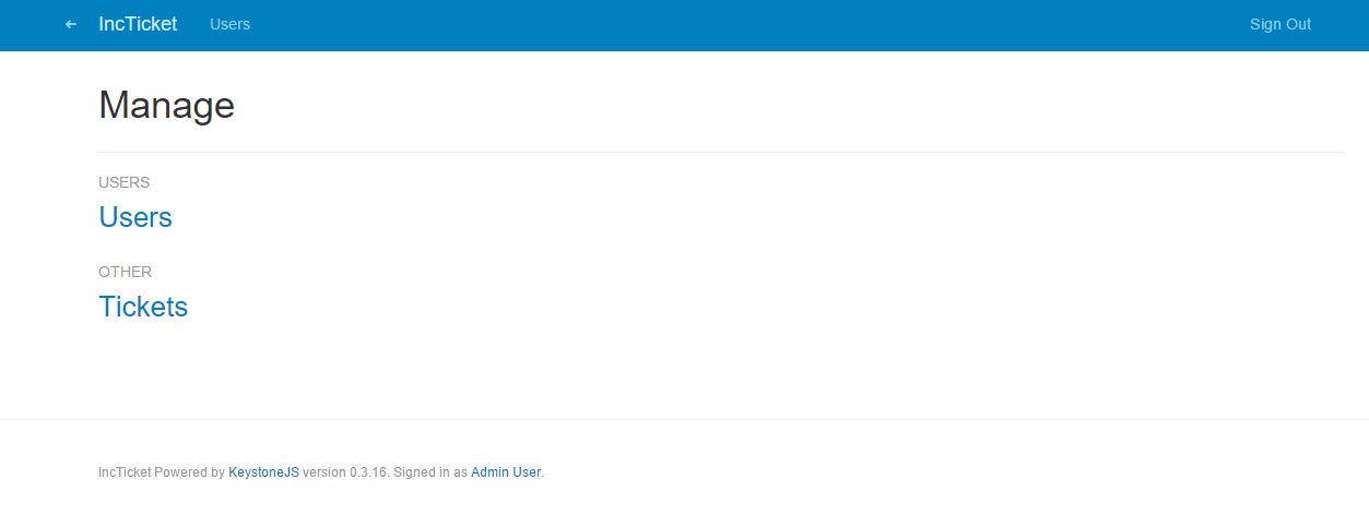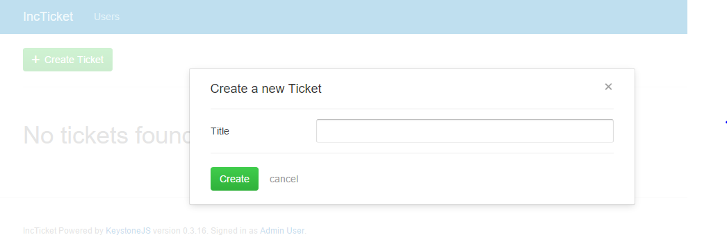 This chapter will cover how to create the IncTicket application using Keystone.js. At the end of this chapter you should have a general idea of how the framework works, understand how the different pieces interact with each other, and give you an understanding on how to easily create Keystone.js projects with basic functionality. This chapter will get you up and running with a project without too many details to begin with.