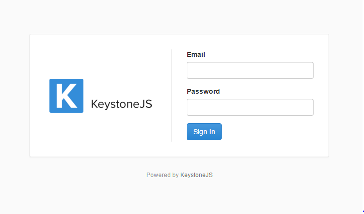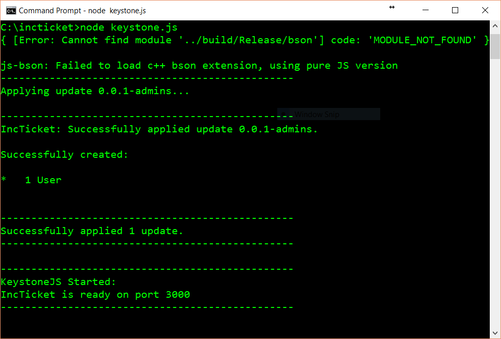 The new project will connect to Mongo DB on local host by default. So if you have Mongo DB up and running, we can serve up Keystone.js using the following command