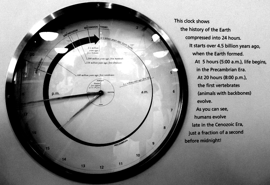You know that from a universal perspective that the world is composed of physical and mathematical laws. Once created, those physical and mathematical laws led to the universe as you know it, and the relations between those universal laws created the bedrock of processes that you think of in-part as time. Over a very long period of time, these processes led to consumers’ personal perspectives within the universe. To the best of science’s understanding, the length of time that passed from the creation of universal laws through natural processes to create consumers’ personal perspectives occurred over many billions of years – over amounts of time that are hard for our minds to consider fully. Look below at this 24 hour clock of Earth’s development located within the Museum of Natural History in New York City. In this clock, humans arose at the top 40,000 years ago, which corresponds to a fraction of a second before midnight: