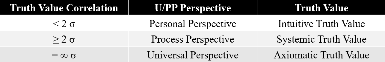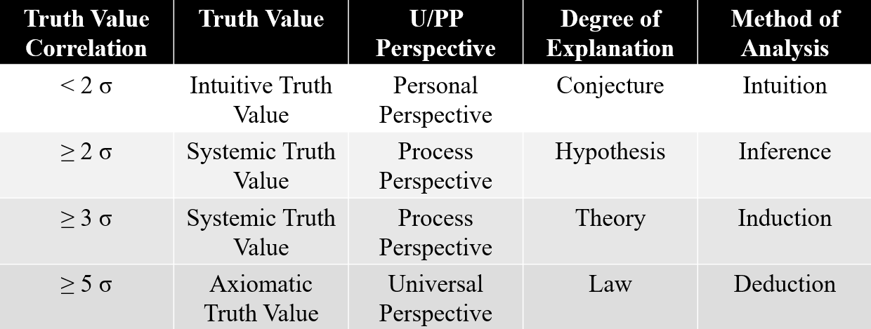 To consolidate these matters in a Lean business ideology, you can correlate the forms of truth-value we described, UPP perspectives, degrees of explanation, and the methods of analysis in a single chart: