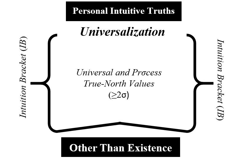 The interior part of the Intuition Bracket contains that which consumers, and thus all of society, agree on an axiomatic or systemic basis. The IB contains that which belongs to consumers themselves, or by their very natures, that which is inherent, essential, proper, of their own, leaving outside the bracket their and all other people’s speculative, intuitive true-north value perspectives they cannot lean toward axiomatically or systematically with at least two sigmas (/≥2σ) of common agreement.122 Let me reemphasize that what I mean by intuition is not what you might psychologically consider intuitive, but rather what people in general cannot axiomatically or systematically agree on at the moment with available knowledge.