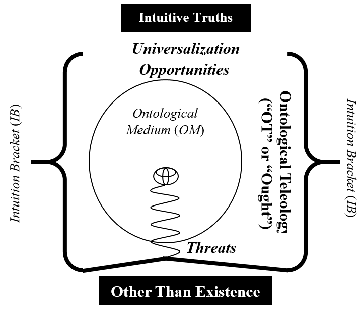 Consumers’ singular objective within the IB through the OT is an apparent end-goal to further exist to find meaning within the boundaries of axiomatic and systemic truths. Generally, people consciously consider only their immediate satisfaction and not their teleological purpose when consuming product within the Ontological Medium as bounded by the Intuition Bracket. Consumers search for meaning through the OT by attempting to spring away from its apparently circular paradox by rational or irrational deed or creed to find linear, goal directed purpose.130
