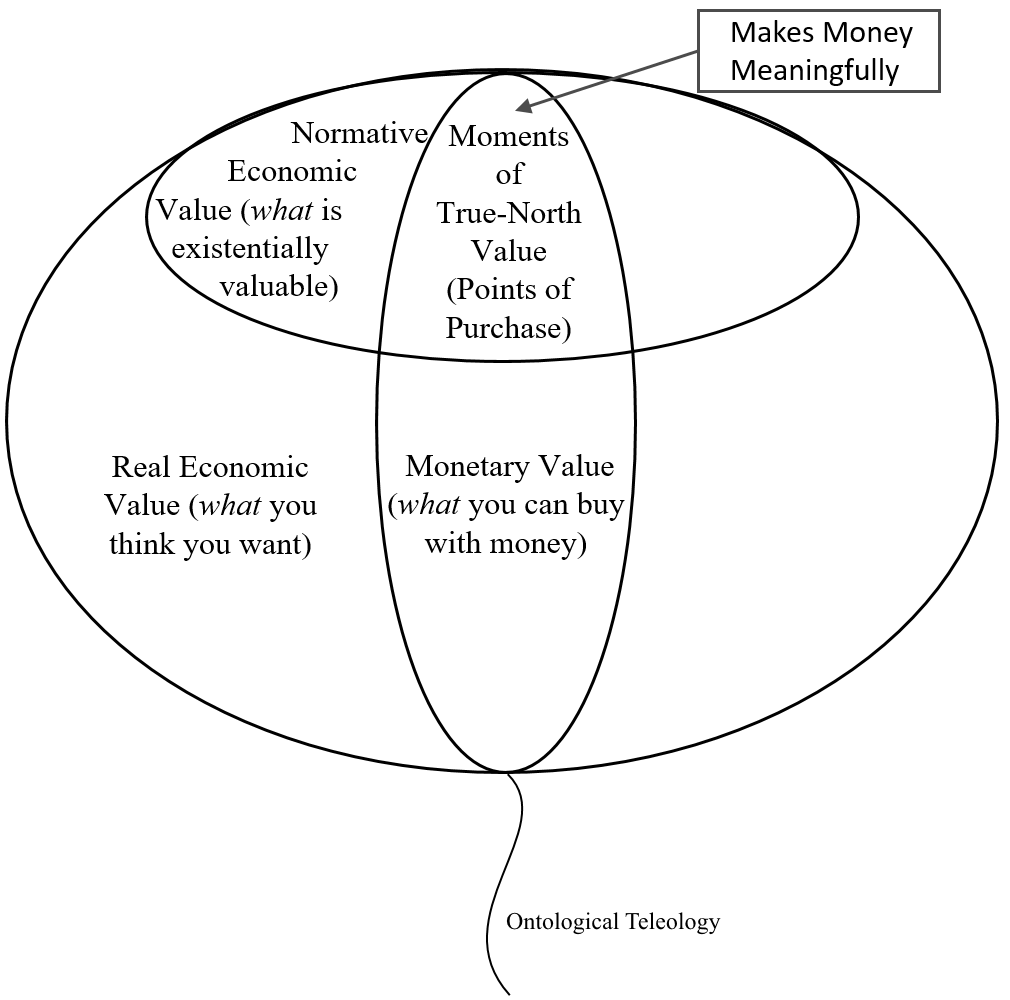 Now, to accurately measure the salable normative, real and monetary value that Lean organizations ought to be producing for money, I suggest that you carefully identify consumers’ speculative, scientismic and theological notions of intuitive value and differentiate them from known universal and process true-north values. Your product will serve each of those true-north values separately. For an organization to reproduce products that accurately addresses these true-north values, it must ground itself as well as possible in what it can axiomatically and systematically validate within consumers’ lives and existences, while recognizing that what consumers believe transcends the apparent circularity of their existences. This is especially true if starting a risky business venture or operating in a new market with limited historical profits since an organization will be bridging itself philosophically forward across unchartered waters toward true-north value that no one has yet discovered.
