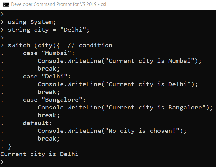 using System; - The using keyword is used to call class libraries which are required to execute the project. Here System is the class library, that is required to call the Console.WriteLine() method later in the Hello world program.