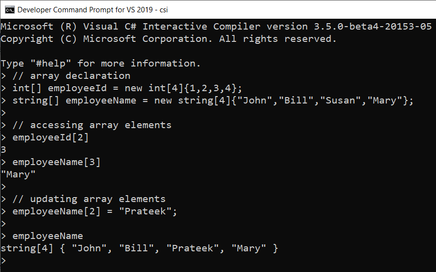stringname="Bill Gates";// convert string array to char and printforeach(charchinname.ToCharArray())System.Console.WriteLine(ch);