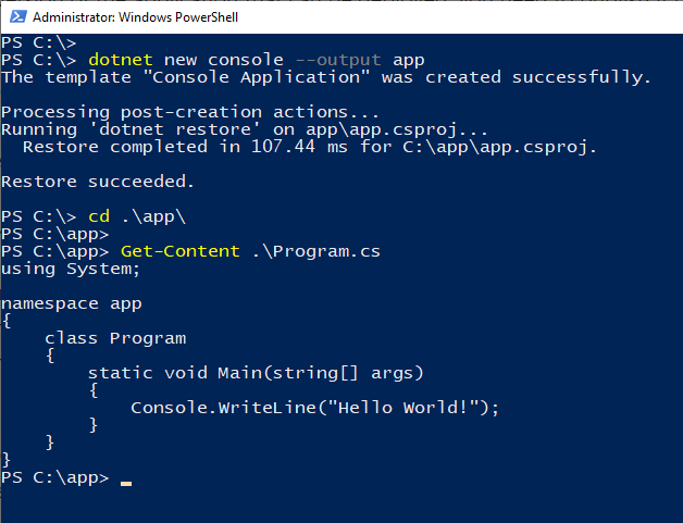 This will create a new console application project and scaffold a folder named: app with the bare minimum files required. One important file created in this folder is program.cs where .cs extension refers to the C# Hello Program or source code file.