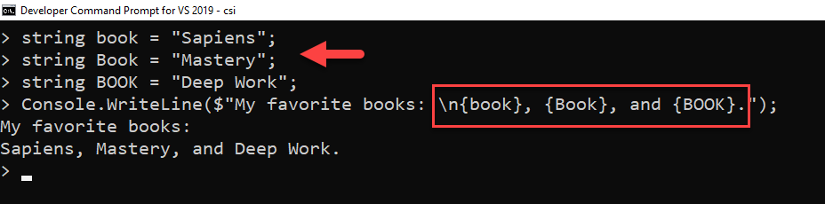 stringname="John";// string concatenationsstringmsg="Hello "+name+", How are you today?";System.Console.WriteLine(msg);
