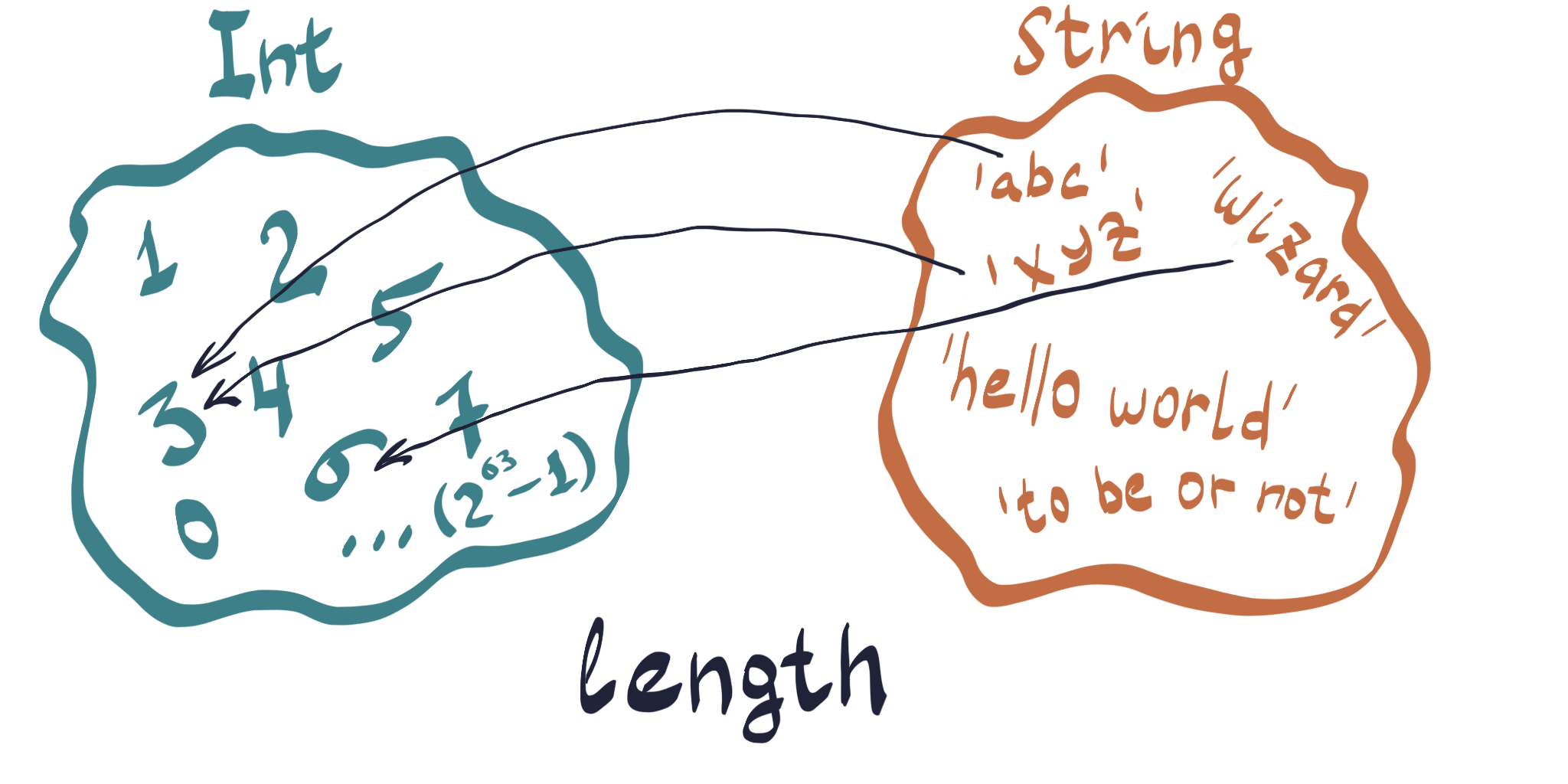 First, we need strings. What is a string? It’s basically just a bunch of characters put together in order. Like “abc”, “xyz” or “Hello World”. This hints at how we can introduce the type String: it’s a set of all possible combinations of characters from Char. Easy, right? We can also introduce another obvious useful function right away, between String and Int, that gives us the length of a string: length :: String -> Int. Try it out in our repl and you should see something like: