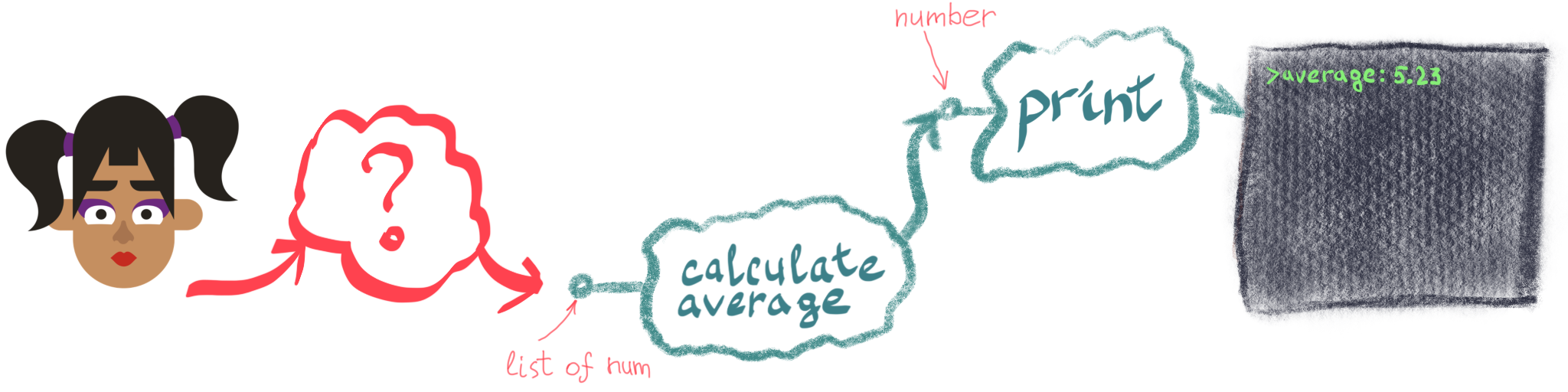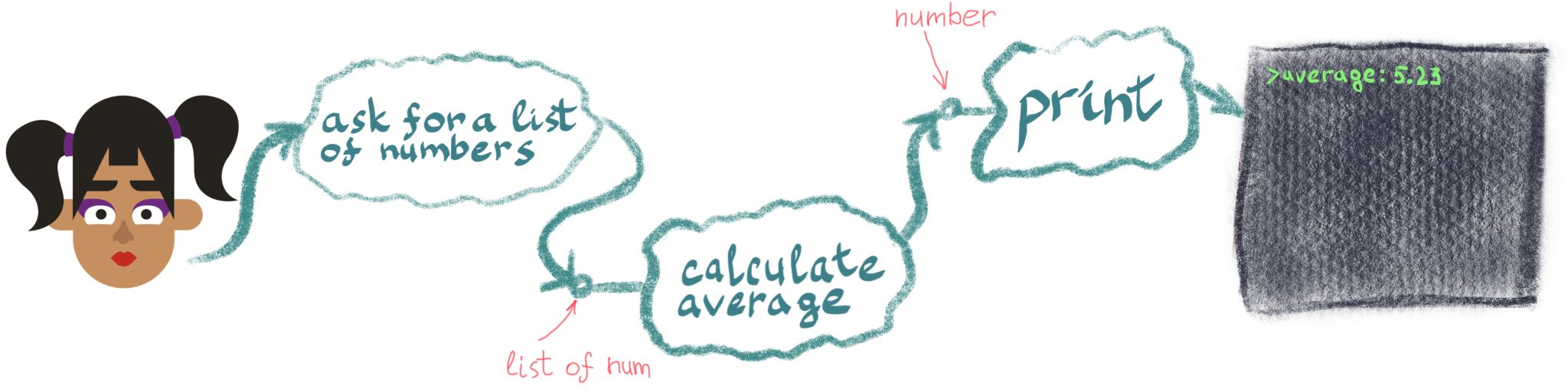 What did we just do? We have broken down or decomposed our problem into smaller pieces, solutions to which we already know or can come up with easily enough, and combined them in the right order to get to the desired result. Just like with the mage above, we cannot give a string or a horse to our calculate average - it expects a list of numbers, so it will not compose with functions that produce something other than a list of numbers! Thus, we came up not only with “spells”-functions that we would need to solve our problem, but also with types that our functions should work with: a list of numbers, a number, an effect of putting something on screen. From the start, just by thinking about how to solve a problem, we “invented” two most important concepts in programming, computer science and mathematics itself: Functions and Types.
