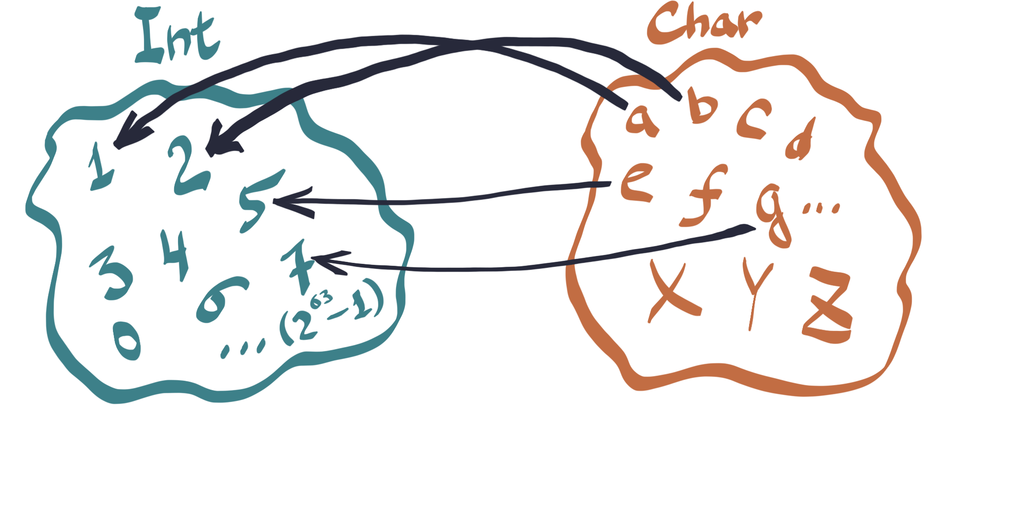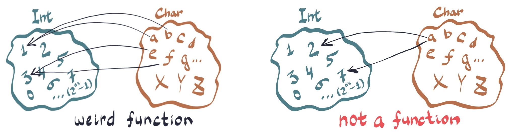 We have just constructed our first function! What it does is match each letter with a number. Now, this is very important: it matches all letters with a number. We could match just some letters to certain numbers - then our function would be called a partial function since it would be defined not for all members of our type. A function can map several members of a type to one member of another type, e.g., we could define a function that matches ‘a’ and ‘b’ to 1, ‘c’ and ‘d’ to 2 etc - it would be a perfectly fine, even if a bit weird, function. However, what we cannot do is define a function that matches a member of a type to several members of another type: