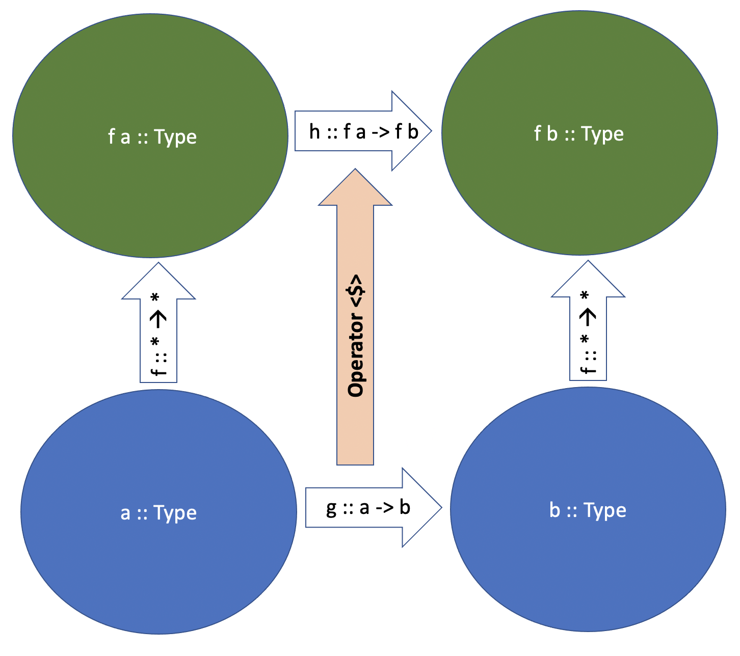 We want this operator, just like in case of Maybe and List, to take a function g :: a -> b and turn it into a function that is lifted into our type function f - h :: f a -> f b. Let’s write out full signatures in our pseudocode to make sure we are clear on what means what. Operator <$> takes a function g (x:a) : b (takes a value of type a and returns a value of type b) and turns it into a function h ( x : f(a:Type) ) : f(b:Type) (takes a value of type f a and returns a value of type f b)
