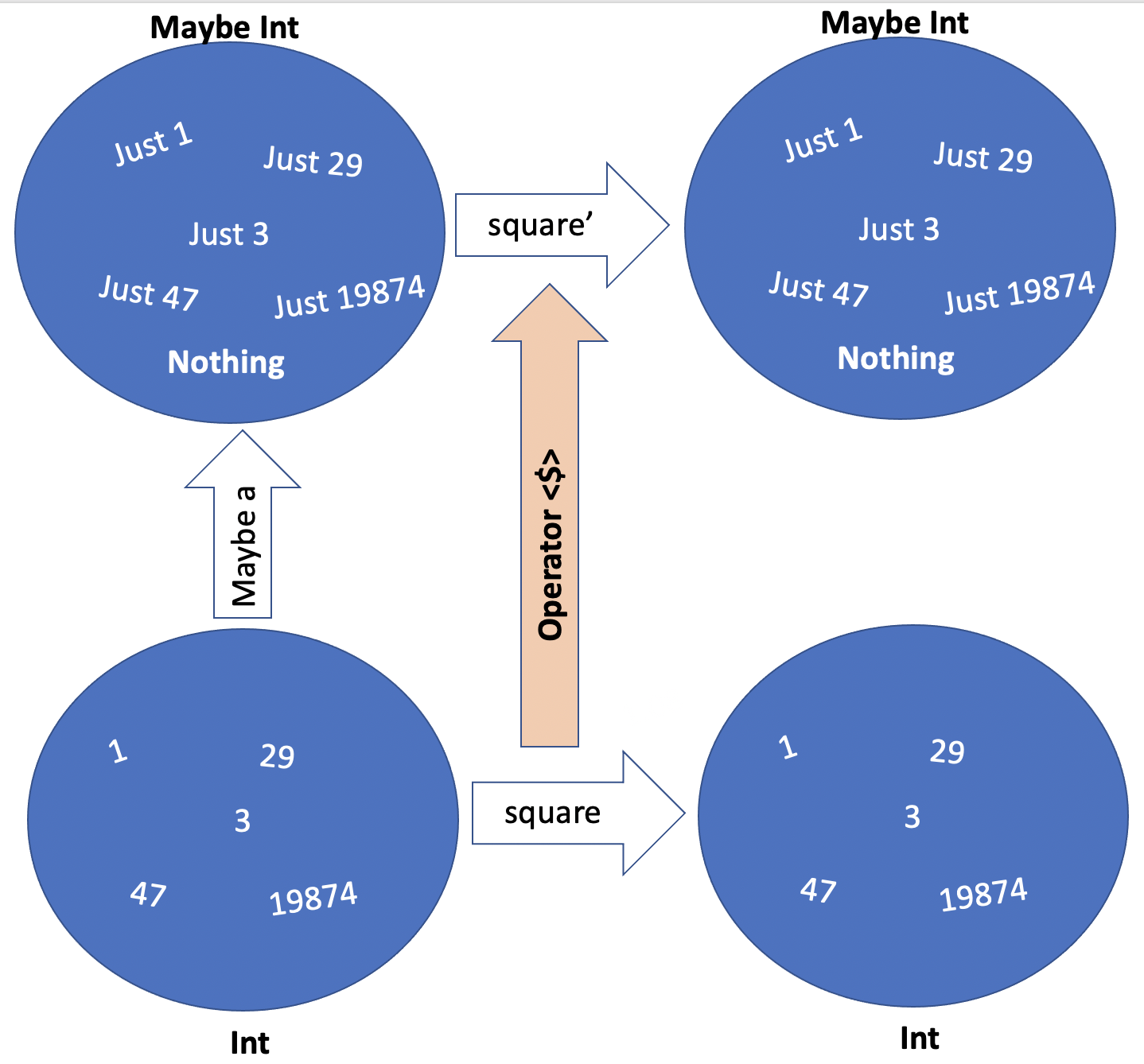 It takes a function between some concrete types a and b and turns it into a function between corresponding Maybes. Now, Maybe a is a type function that you should read as Maybe (a:Type) = ... What other type functions do we know by now? Of course it’s a List, or [a]! Can you define operator <$> that would take a function a -> b and turn it into a function between corresponding lists - [a] -> [b]? I know you can. Do it. Do it now.