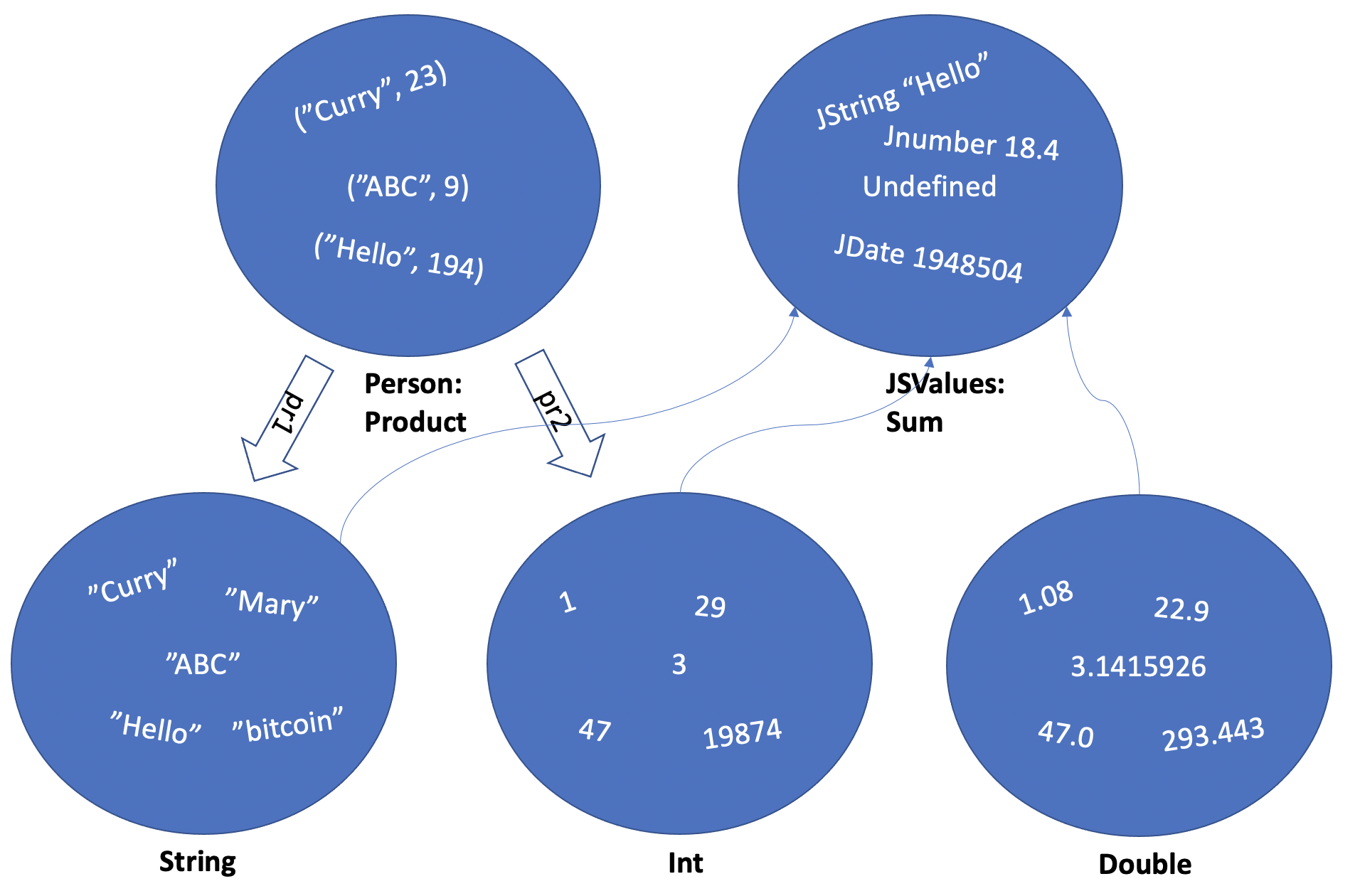Now, this is interesting - we have combined three types that “store” a String, an Int and a Double inside a constructor and add a simple value “Undefined” as the fourth possible value. It means that values like JString "hello world", JDate 12345225 (which is quite a long time ago), JNumber 3.141 and Undefined are all valid values of the type JSValues. This is a sum type.