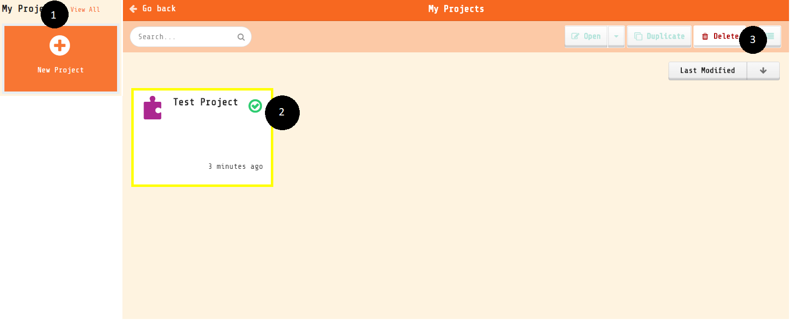 Return to the home screen. Notice that you now have two copies of your project in the My Projects area. We do not need this extra copy, so let’s delete one of them.