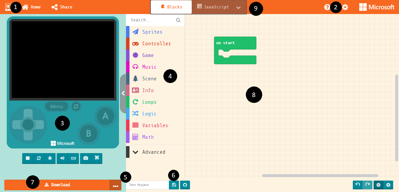 When you open the MakeCode Arcade environment without opening a shared game, you will see something similar to the screenshot in Figure A-B.