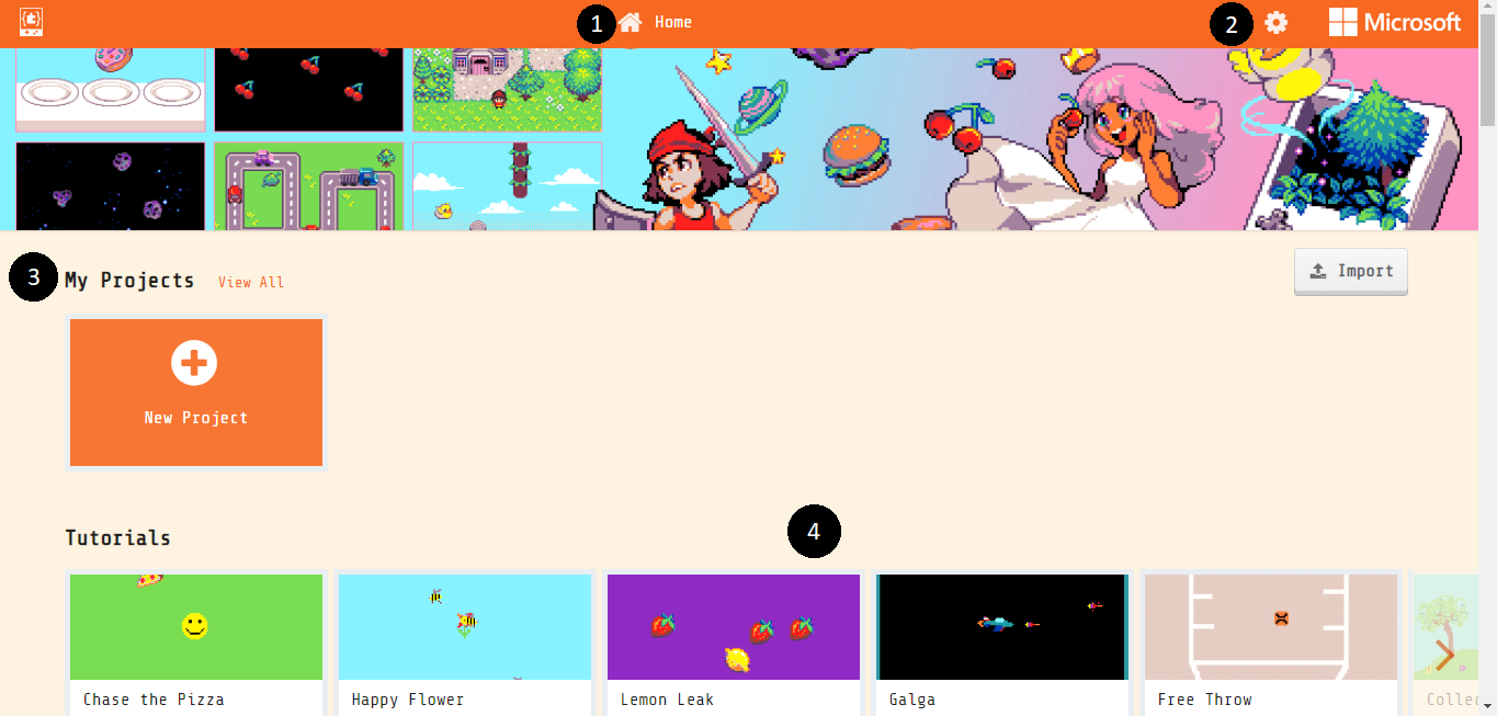 Some of the elements of the MakeCode Arcade home screen are described below: