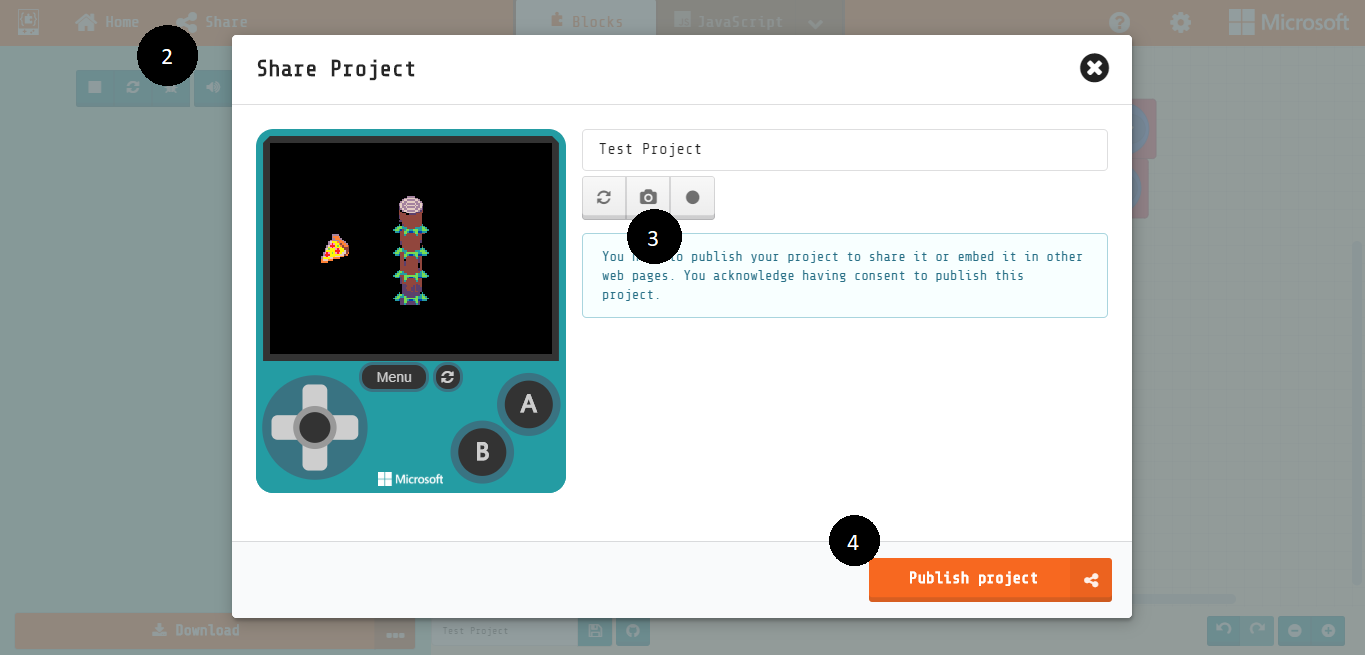 There are several ways to share your projects with others. You already have learned to create a cartridge for your game. You can share that file with others, and they can load your cartridge into MakeCode Arcade. Another way to share a project is to send a copy to the MakeCode servers to get a custom URL.