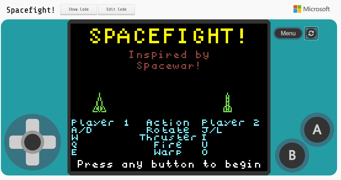Play Spacewar! for a little bit. Feel free to ask a friend to play against you! After you have played Spacewar! for a little while to learn the in-game controls, we will learn more about the MakeCode Arcade interface.