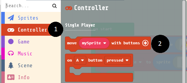 To finish our first project, we need to add the ability for the player to control one of the sprites. MakeCode Arcade makes that easy! Follow these steps: