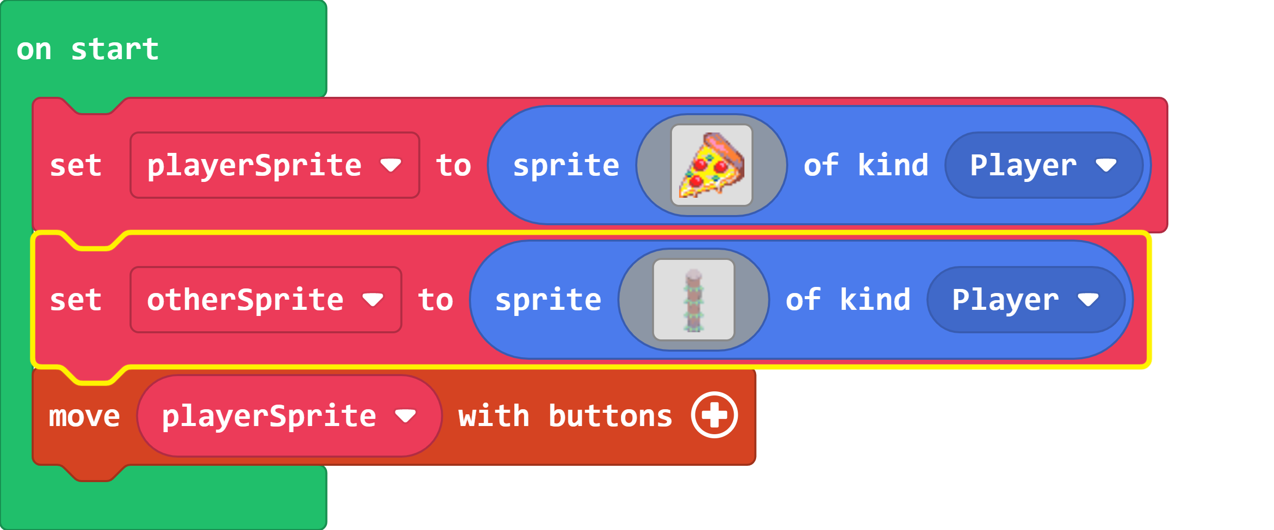 - In the move sprite with buttons block, set the sprite variable to the one that you want the player to control.