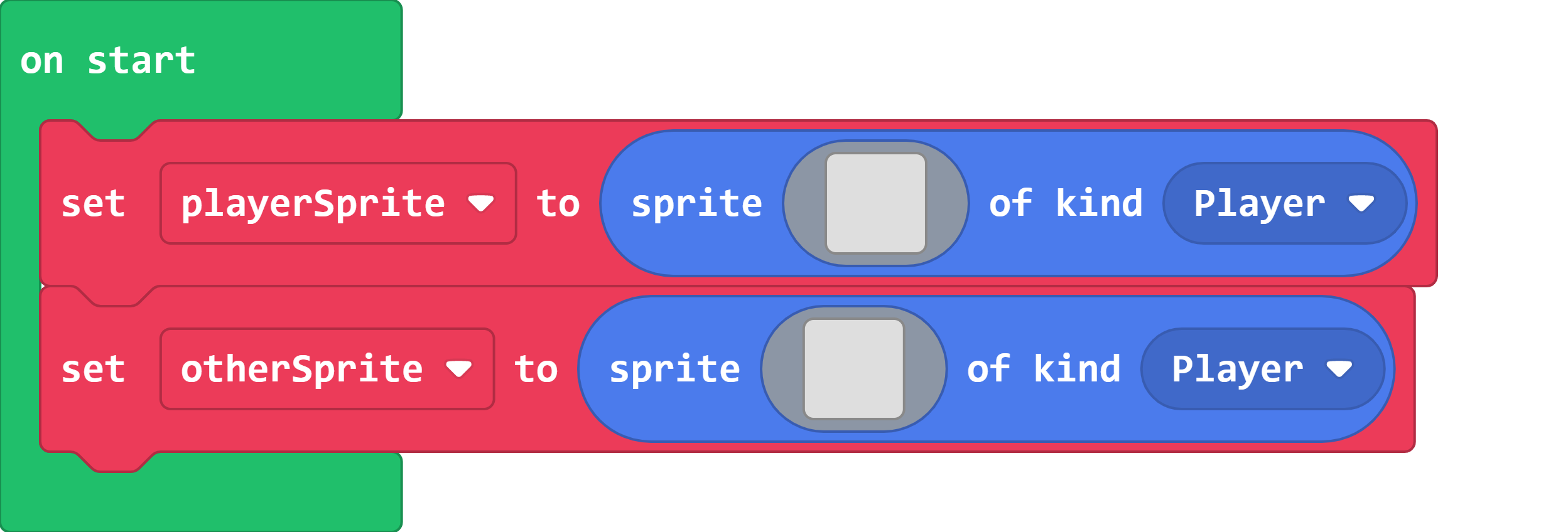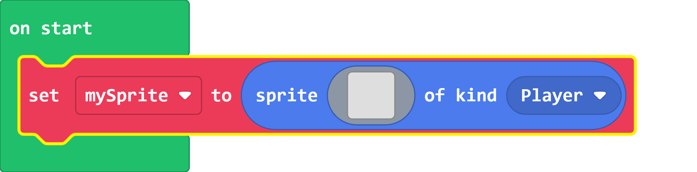 The on start block is automatically added to your project when MakeCode Arcade creates it. Simply drag your set sprite block into the on start block so that it runs at the beginning of your game. When you drag the block into the on start block, notice that it is not longer disabled.