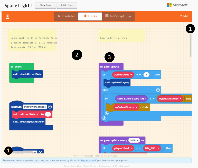 Feel free to go back and forth between playing the game in the Simulator interface and looking at the code in the Show Code interface. As you explore the code, take some screenshots and jot down some notes on different blocks. Perhaps you want to understand a particular block more. Perhaps you have an idea of what a certain block does and you want to remember it for later. Perhaps you want to test a hypothesis by changing some code and seeing its effects.