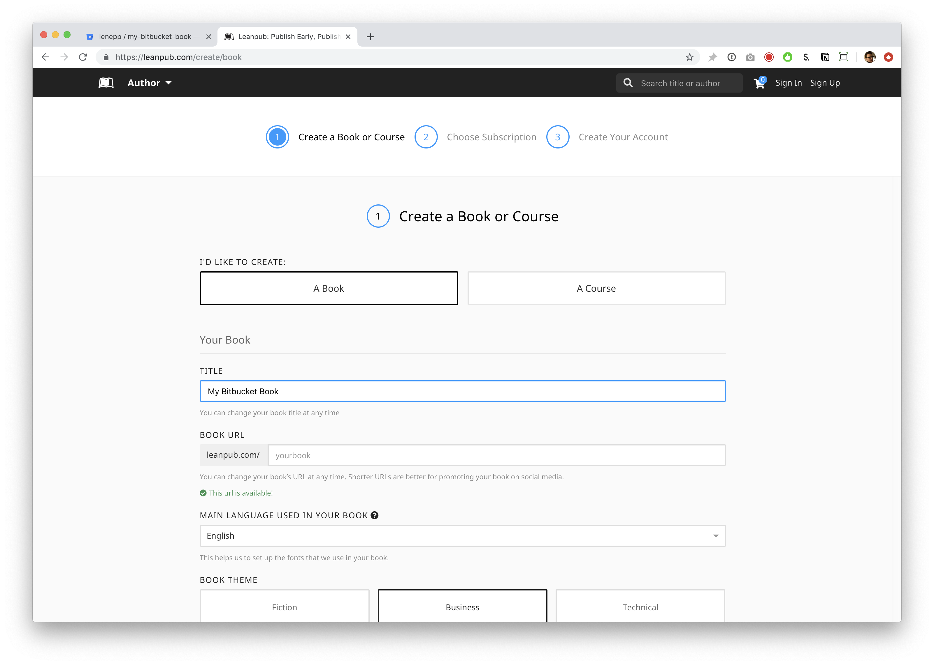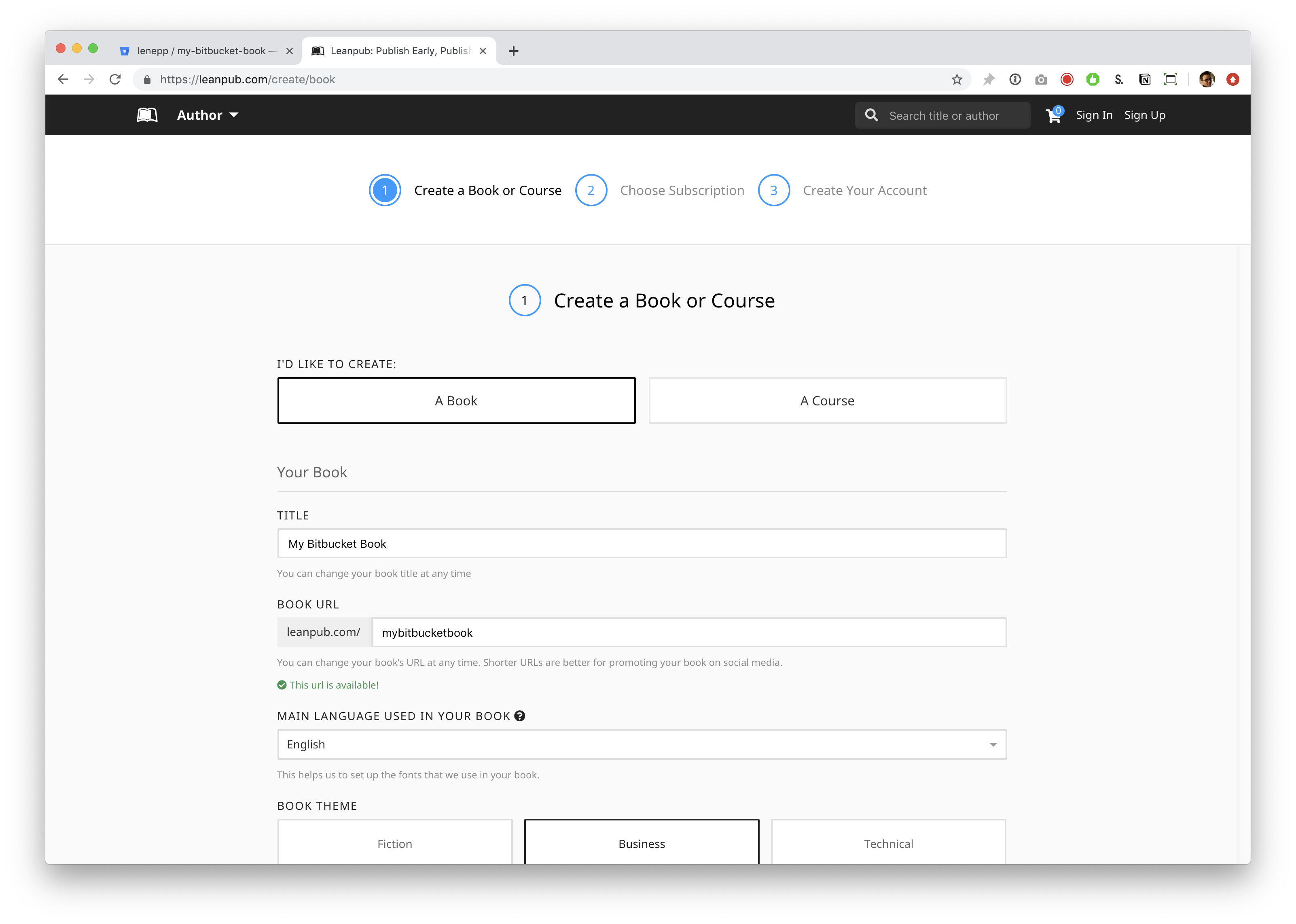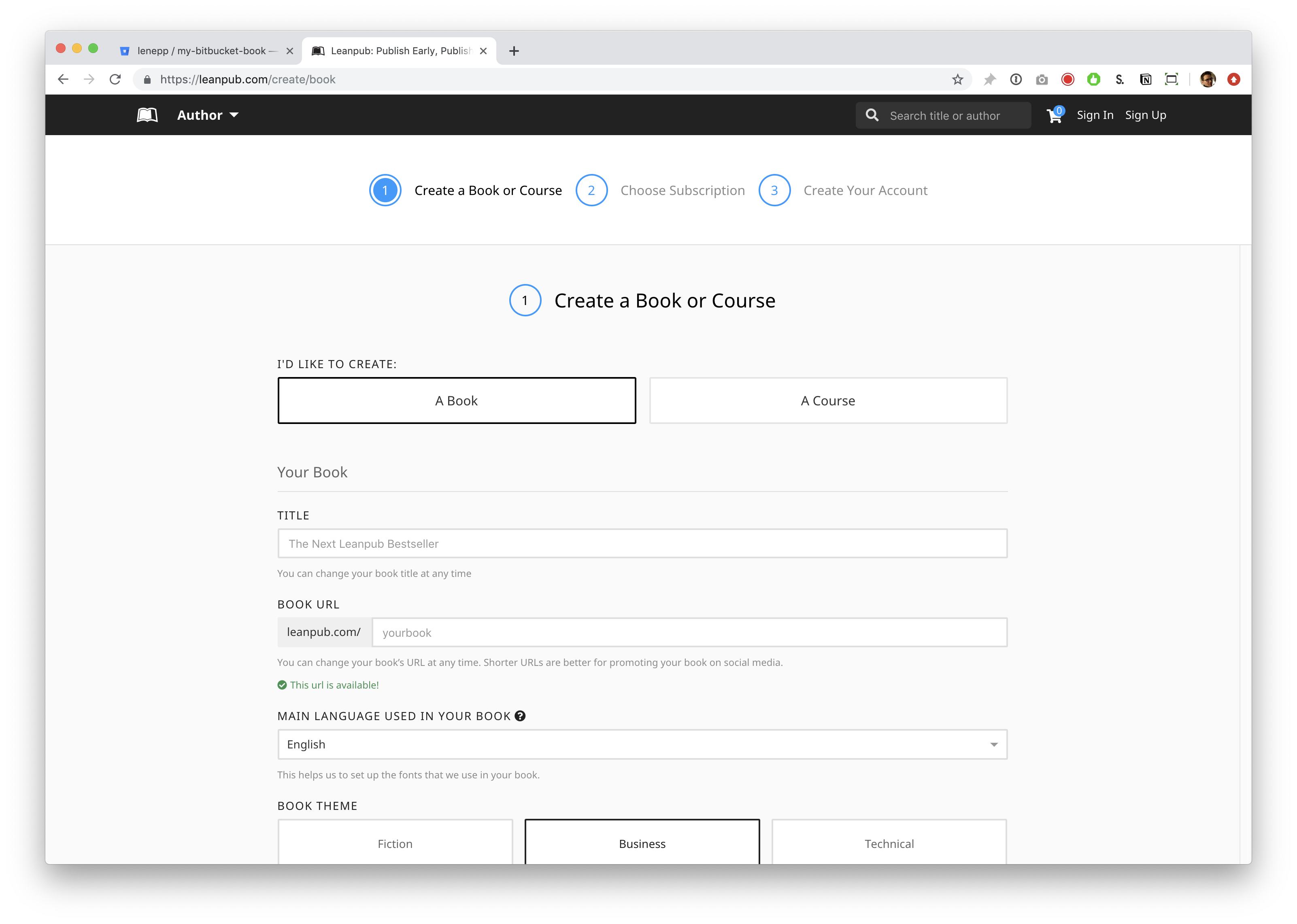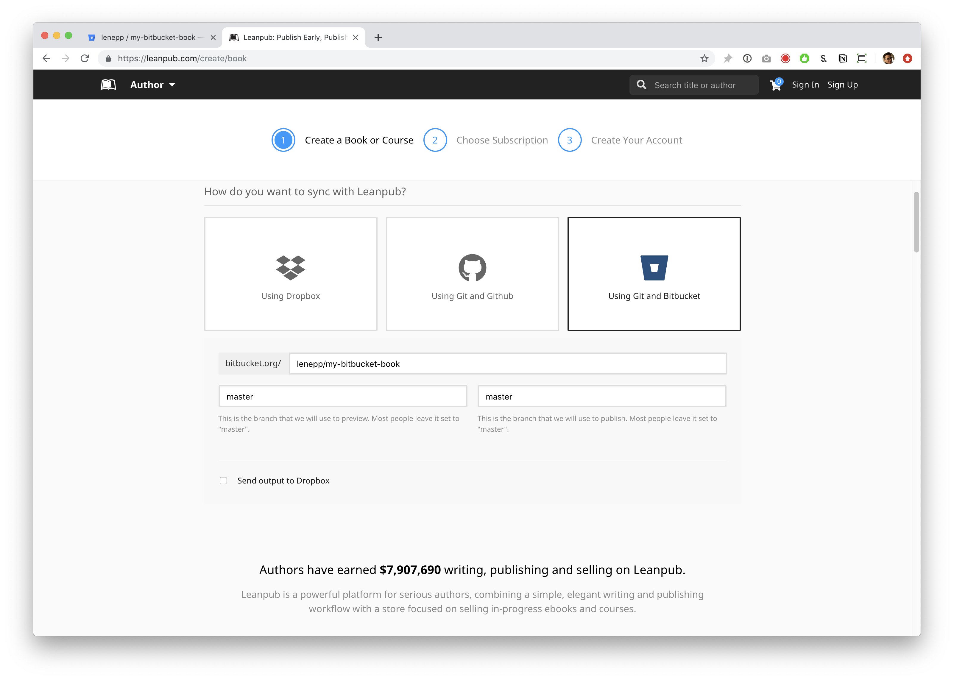 This will take you to a page where you can set up a new repository for your Leanpub book.