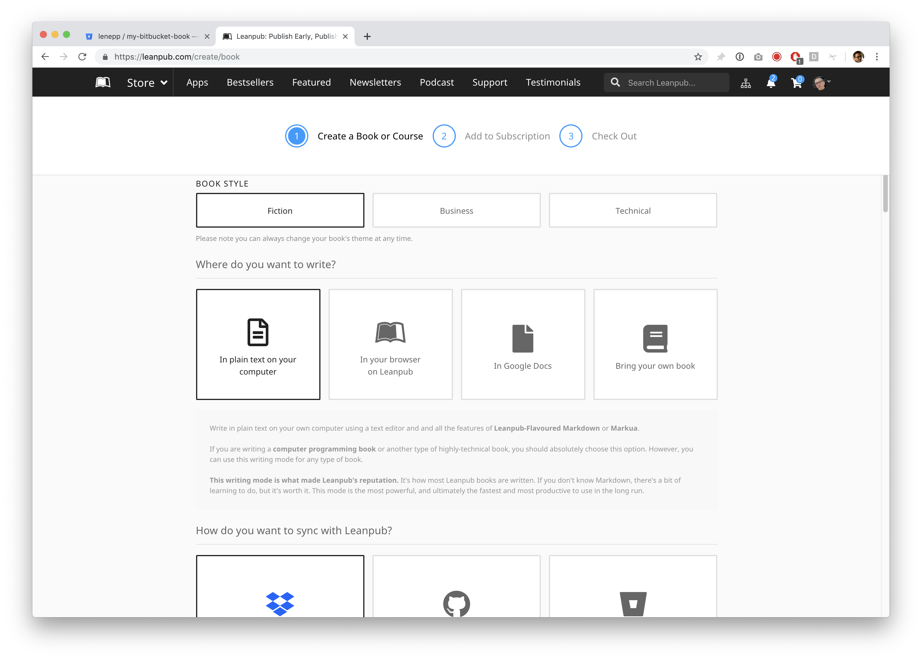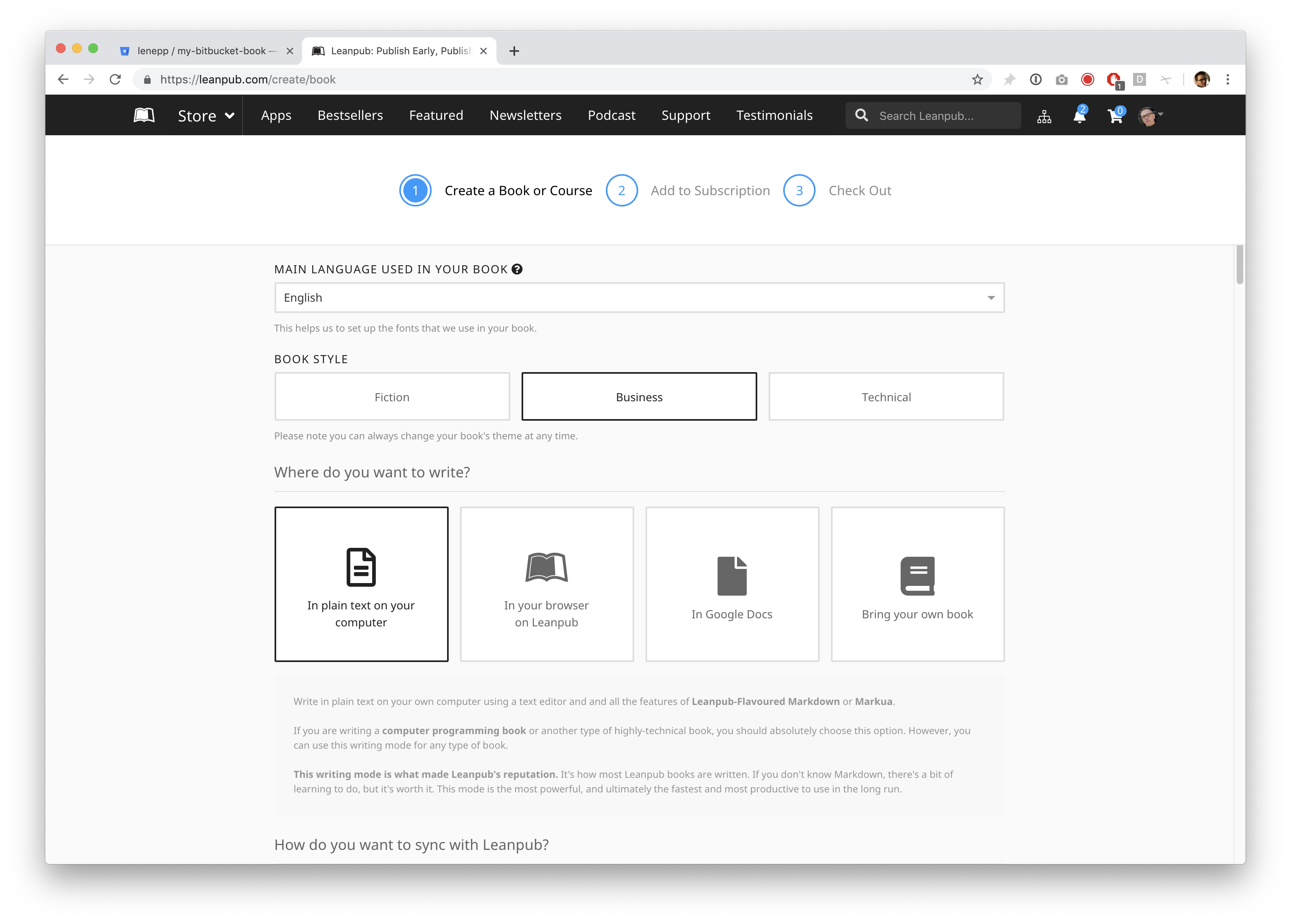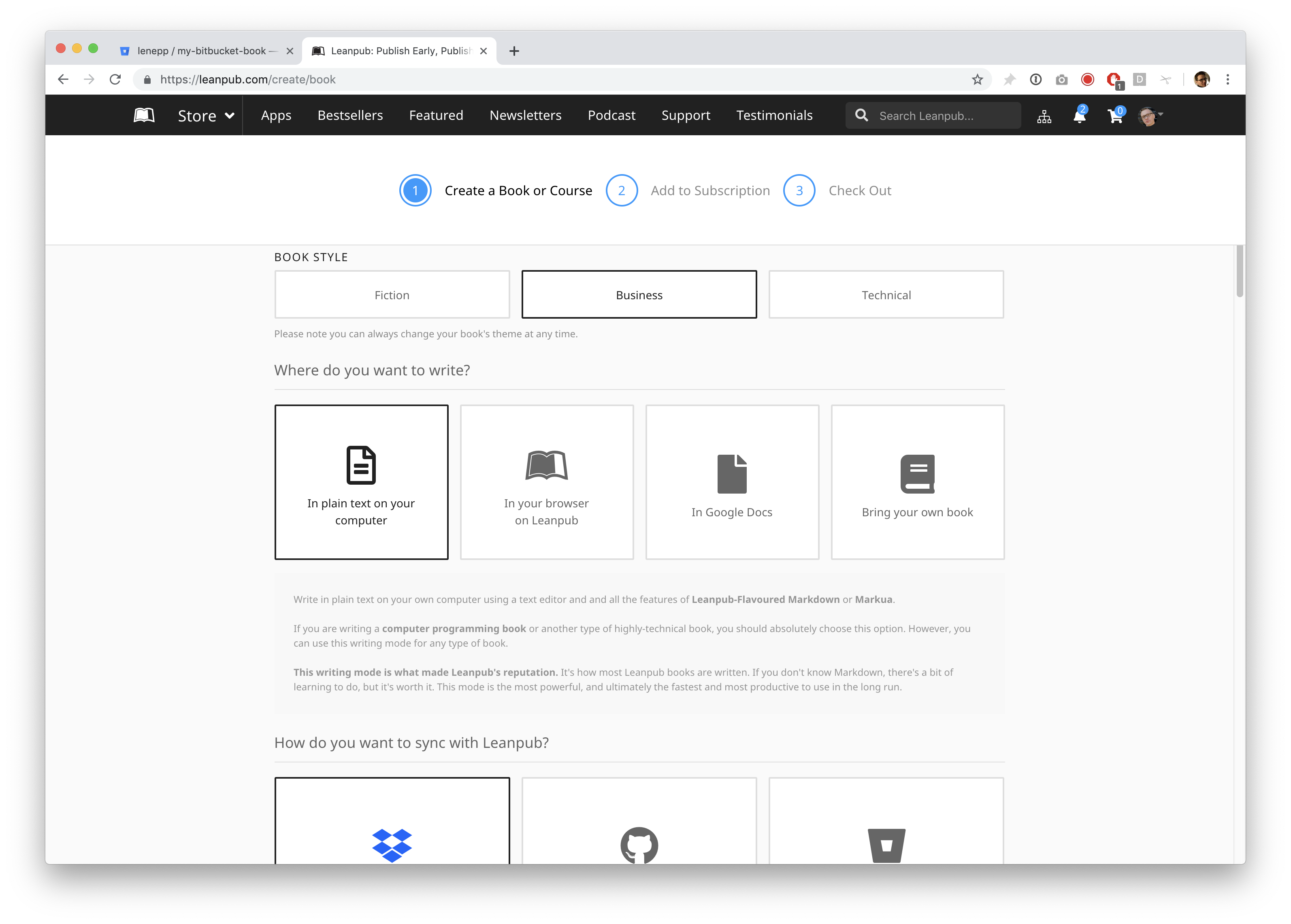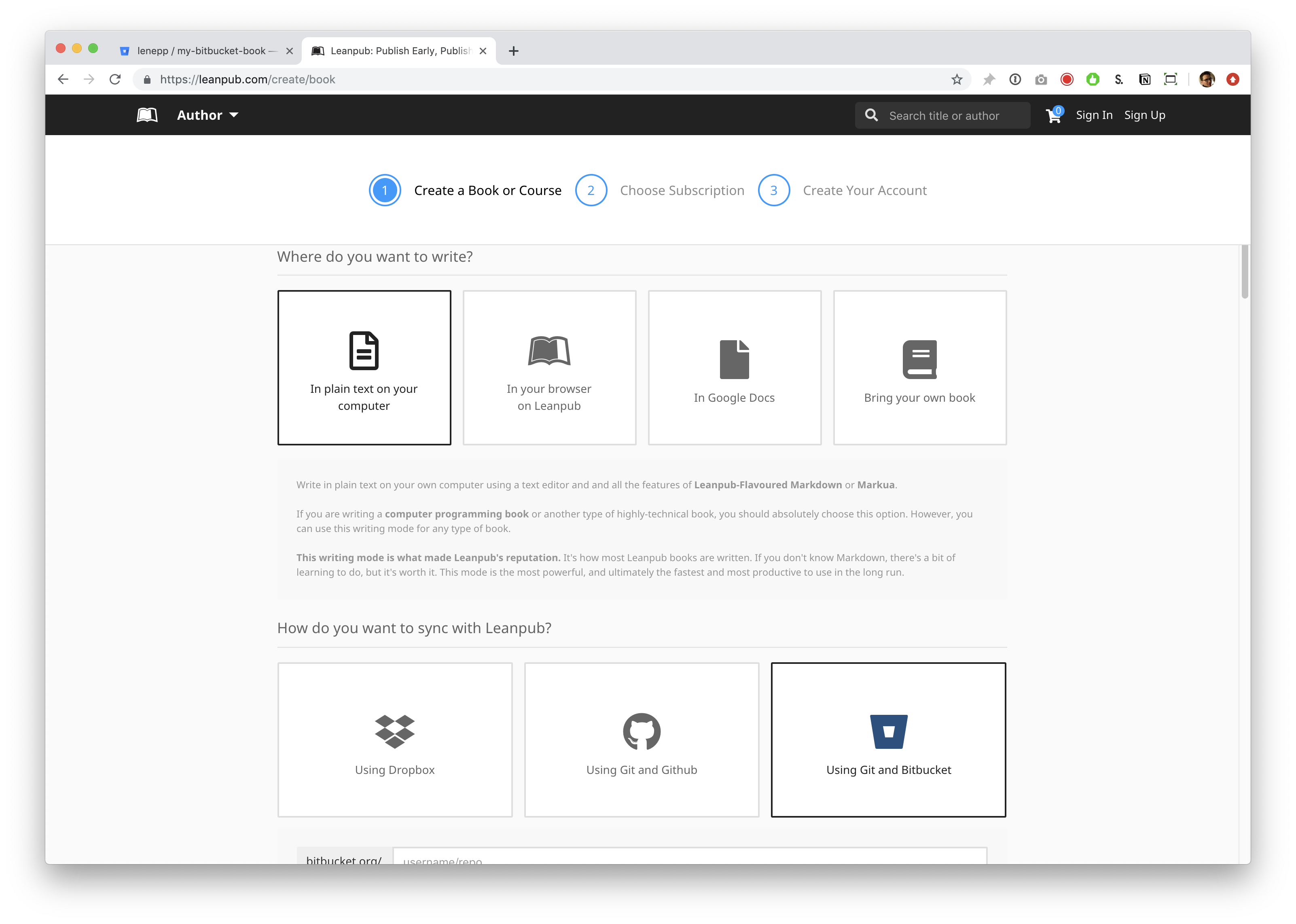 Go to https://leanpub.com/create/book to create a book in Bitbucket writing mode.
