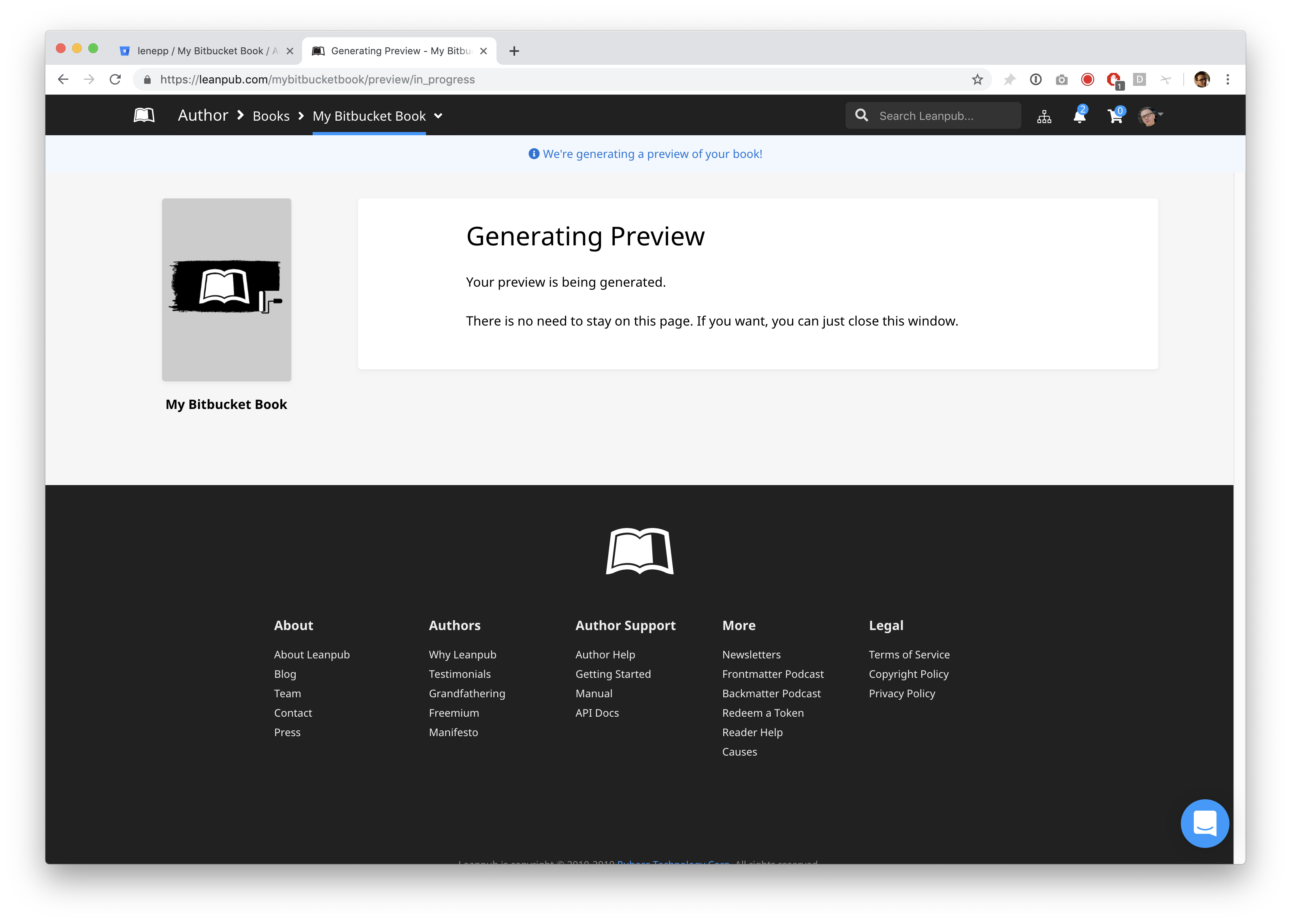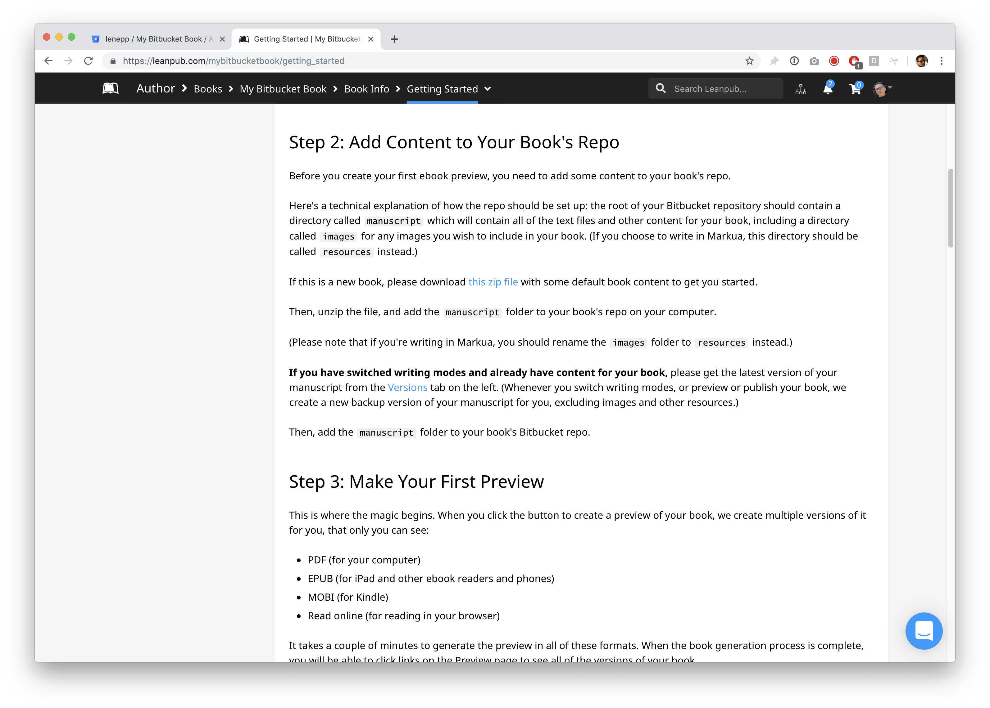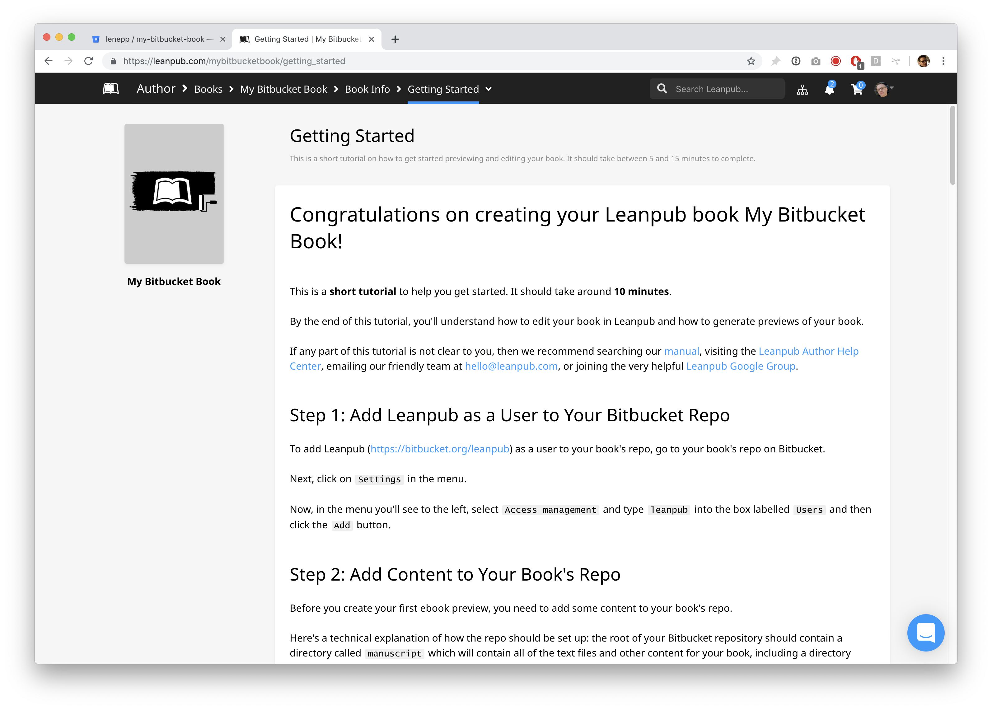 Congratulations! You’ve completed the Getting Started tutorial for writing a book in Leanpub using Bitbucket.