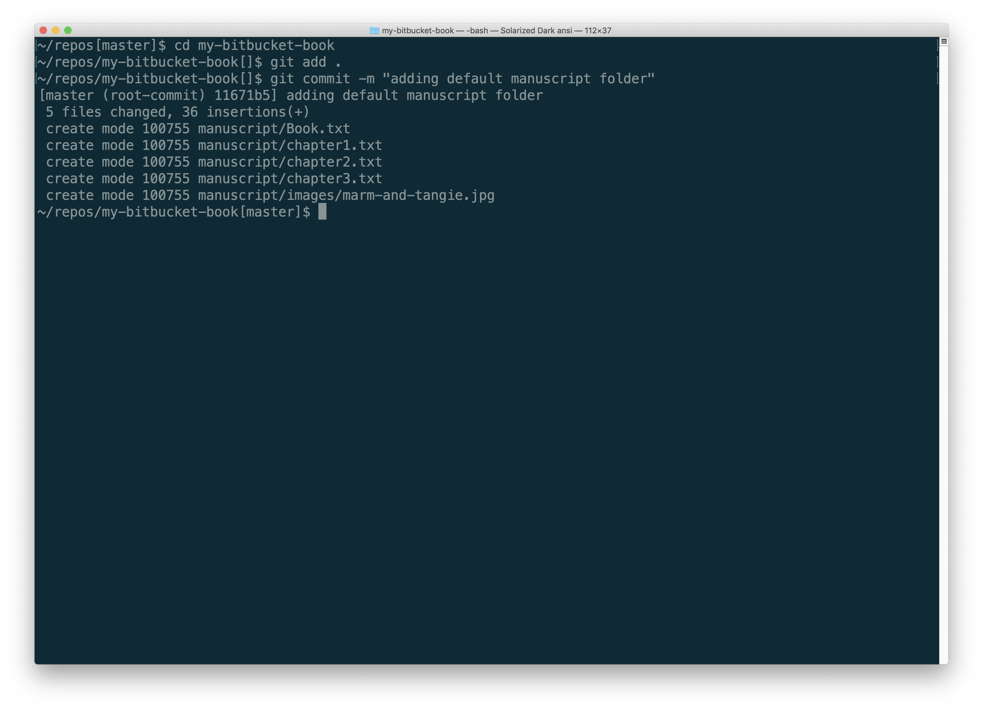 Type git commit -m "adding default manuscript folder". You will see messages indicating that the content has been committed.