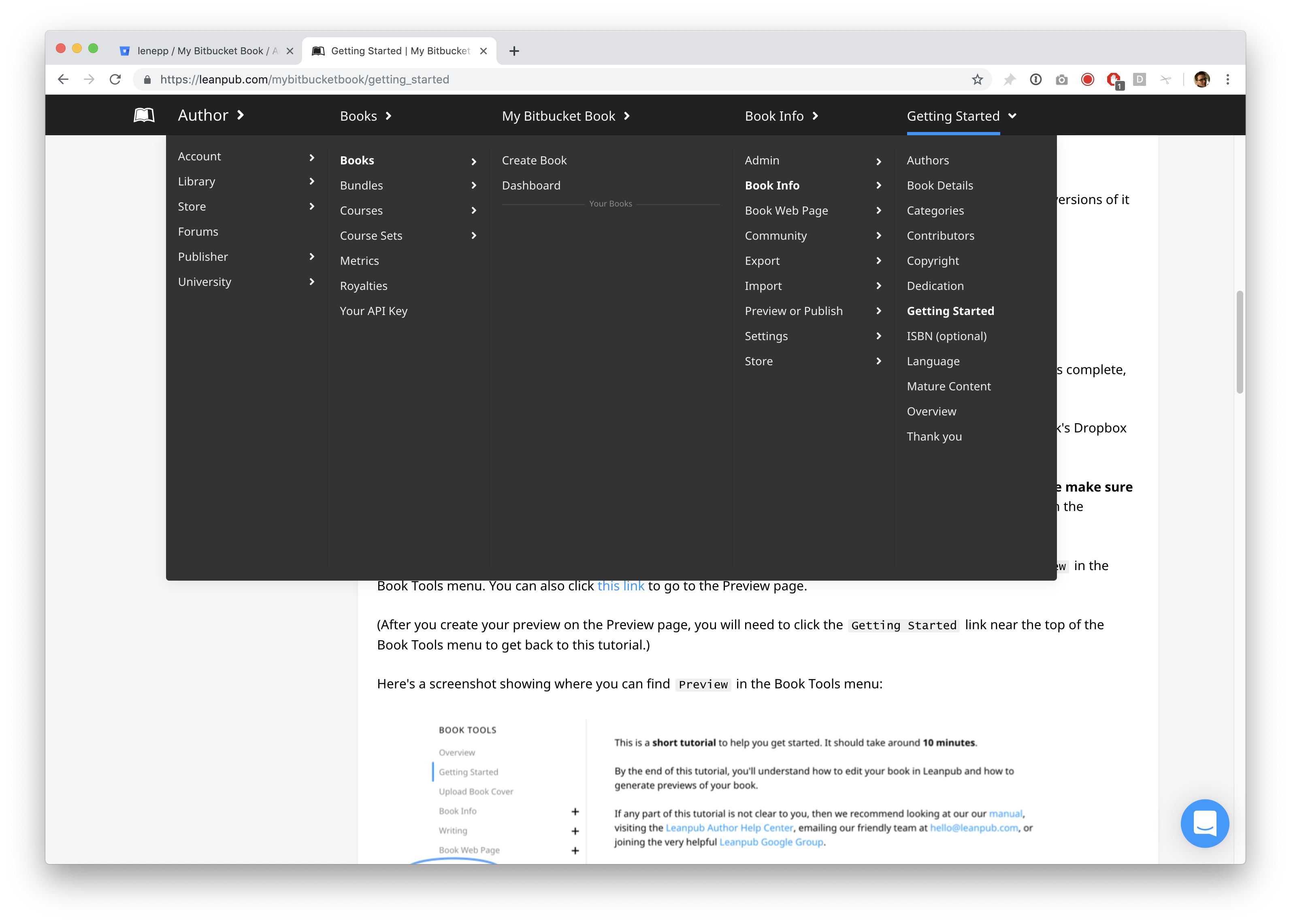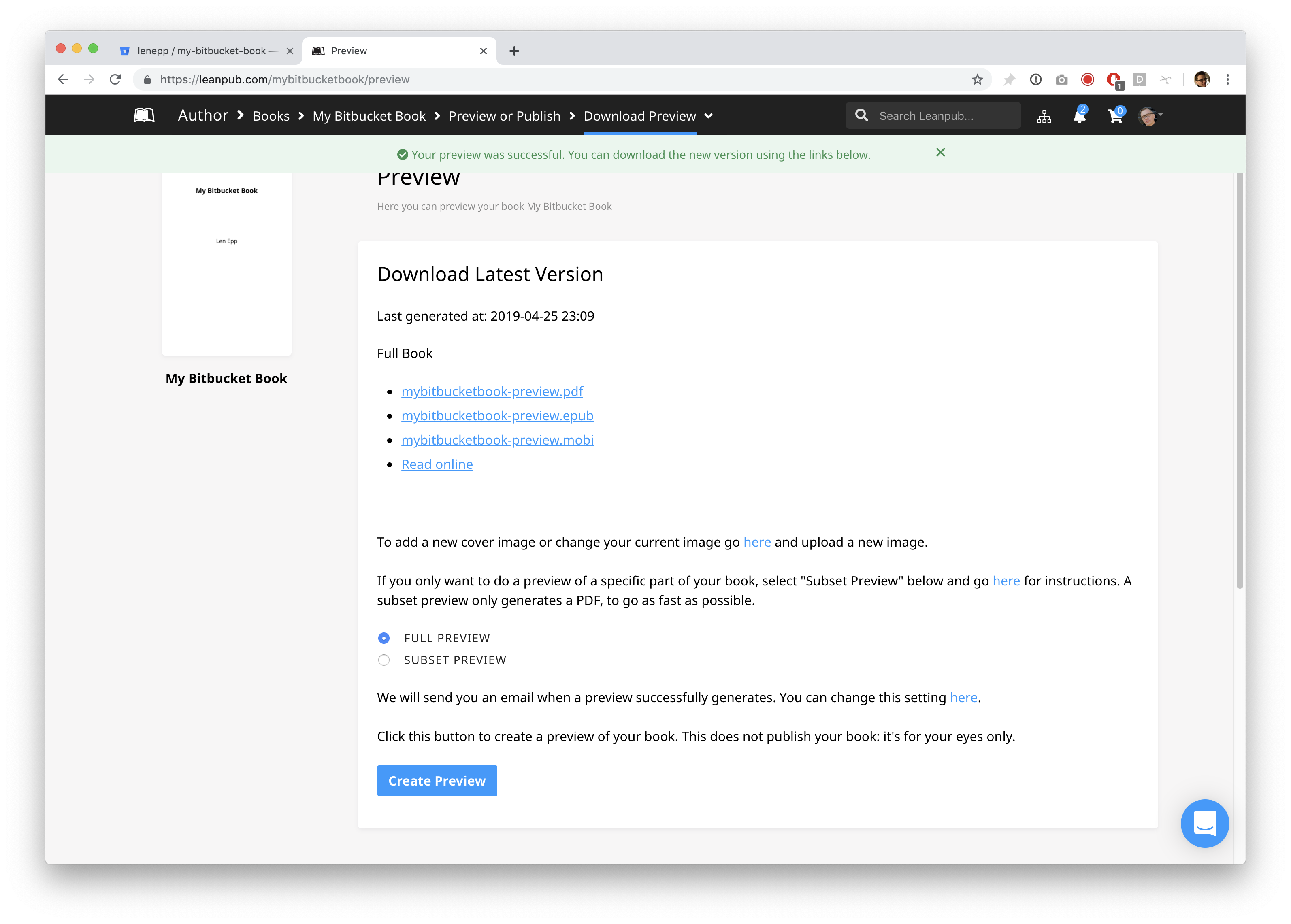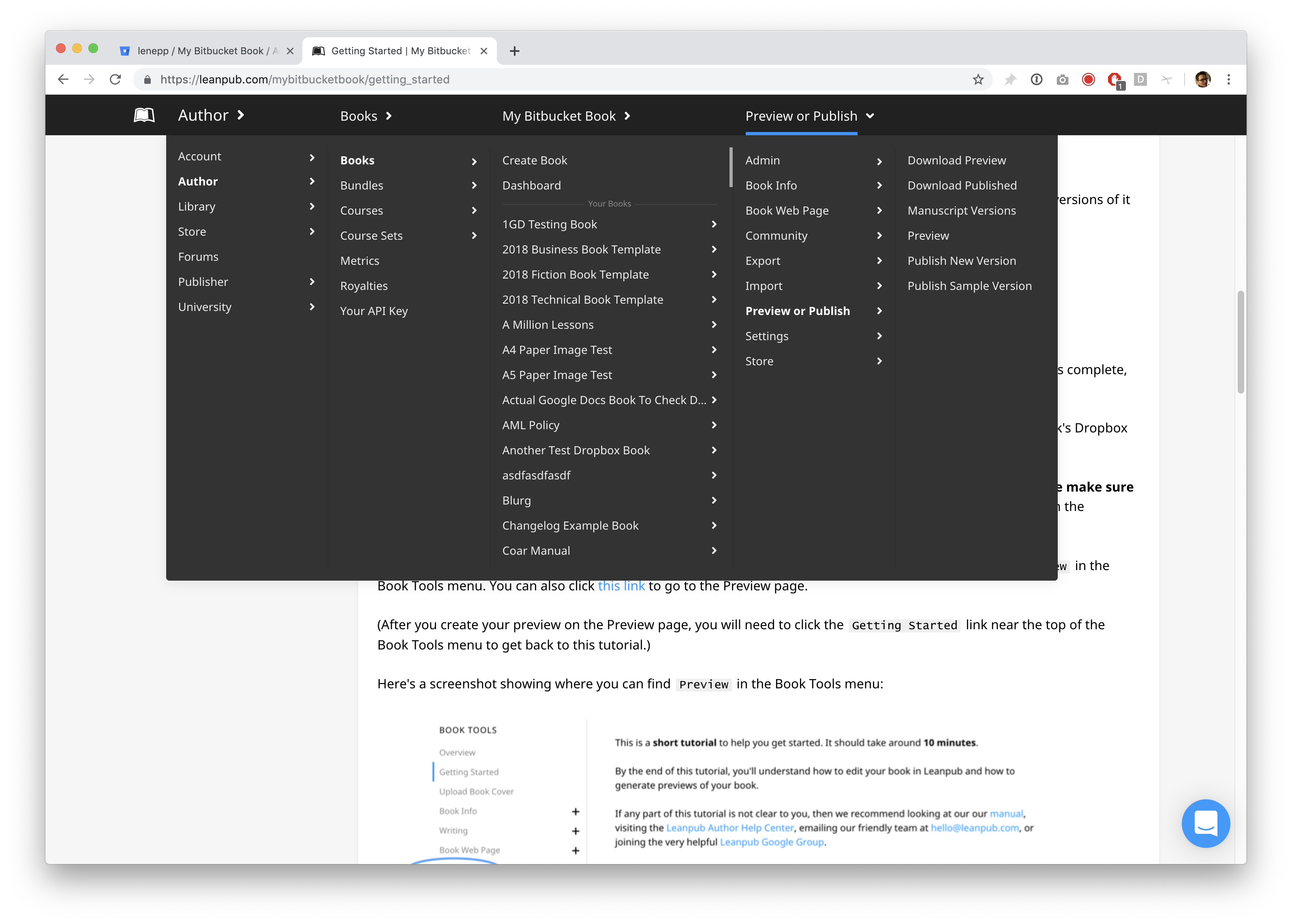 To create a new preview, repeat what you did when you made your first preview, by using the Author menu in Leanpub to go to: