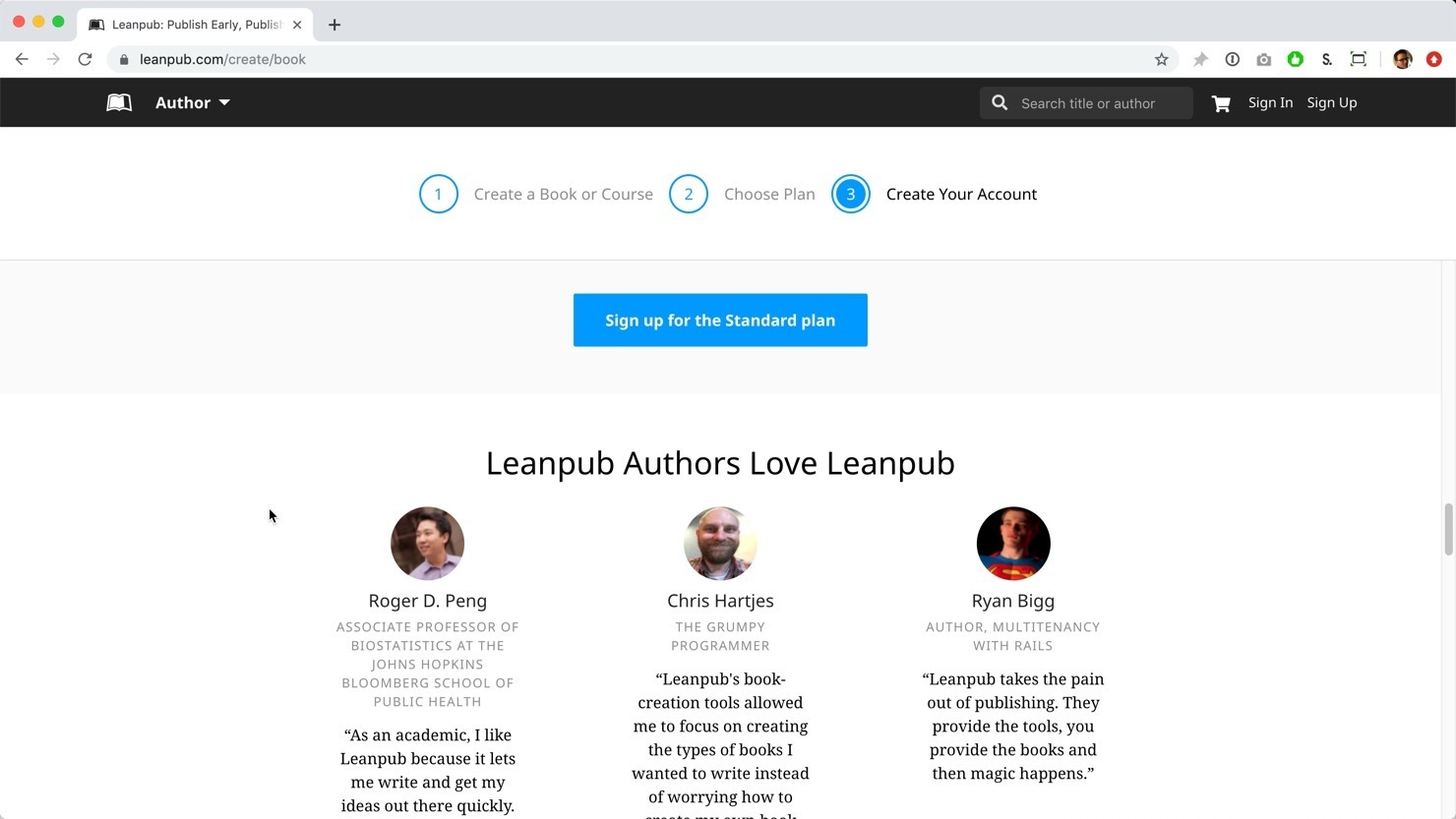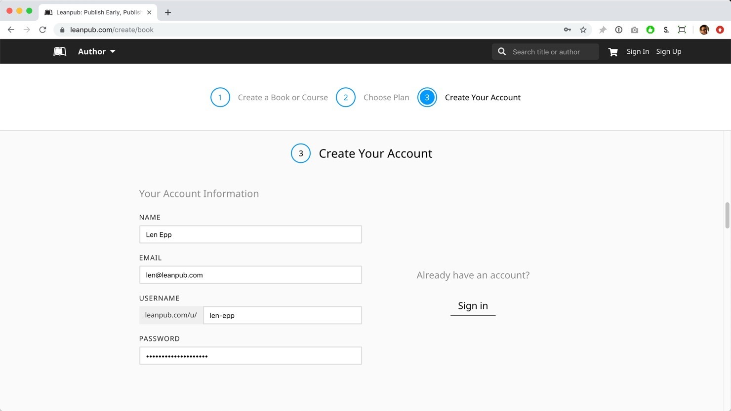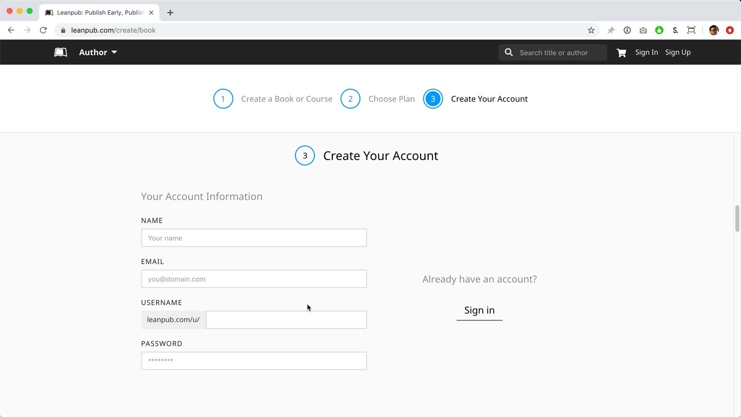 Scroll down and, if you are not signed in to a Leanpub account, you will see an option to enter information to create a new account. You will also see an option to sign in, if you already have a Leanpub account.