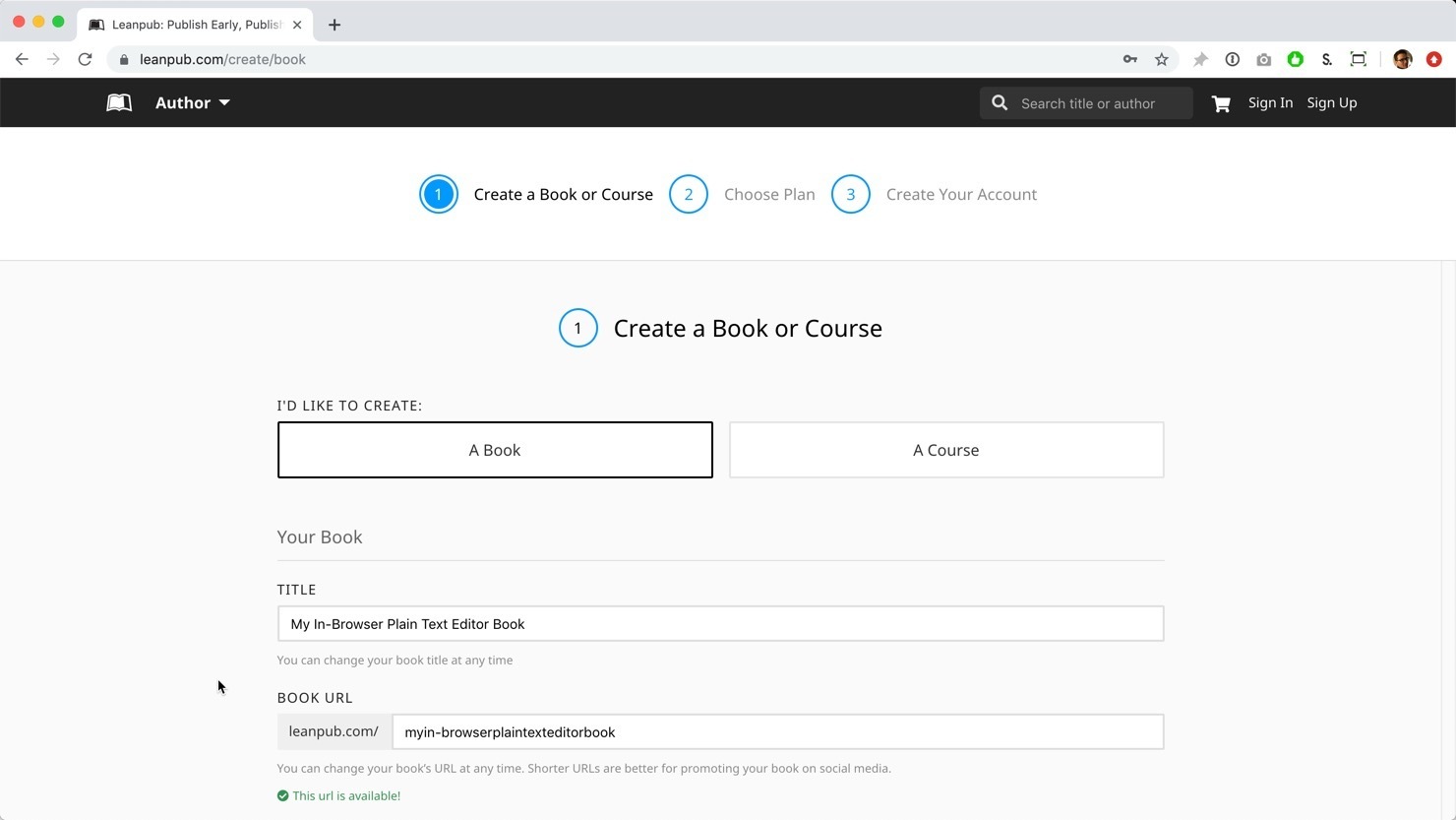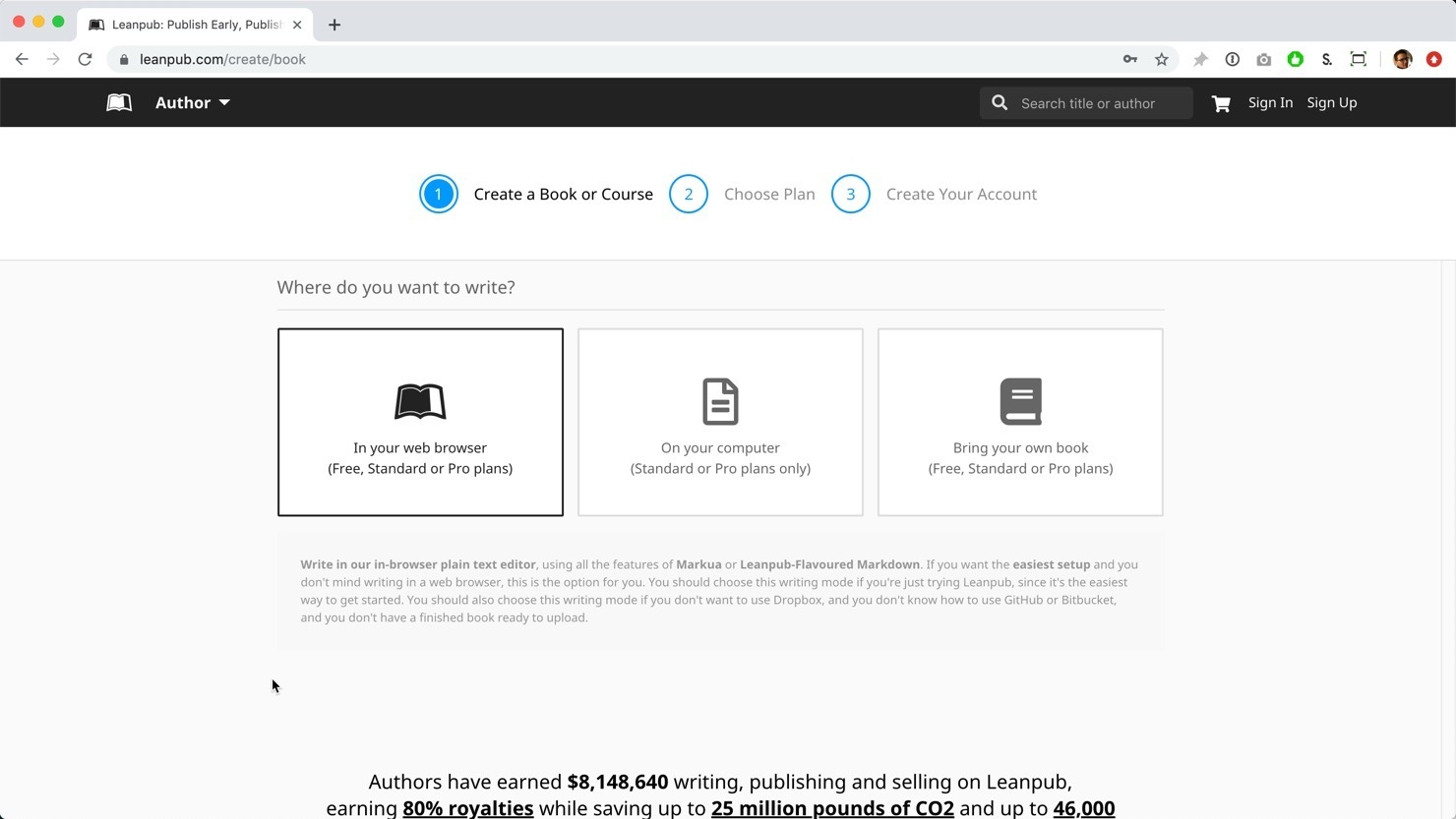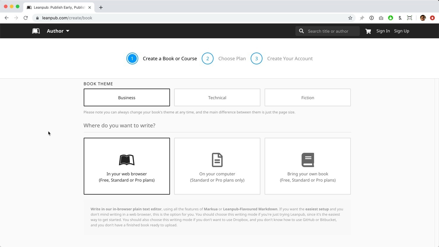 Go to https://leanpub.com/create/book to create a book in our In-Browser Plain Text Editor writing mode.